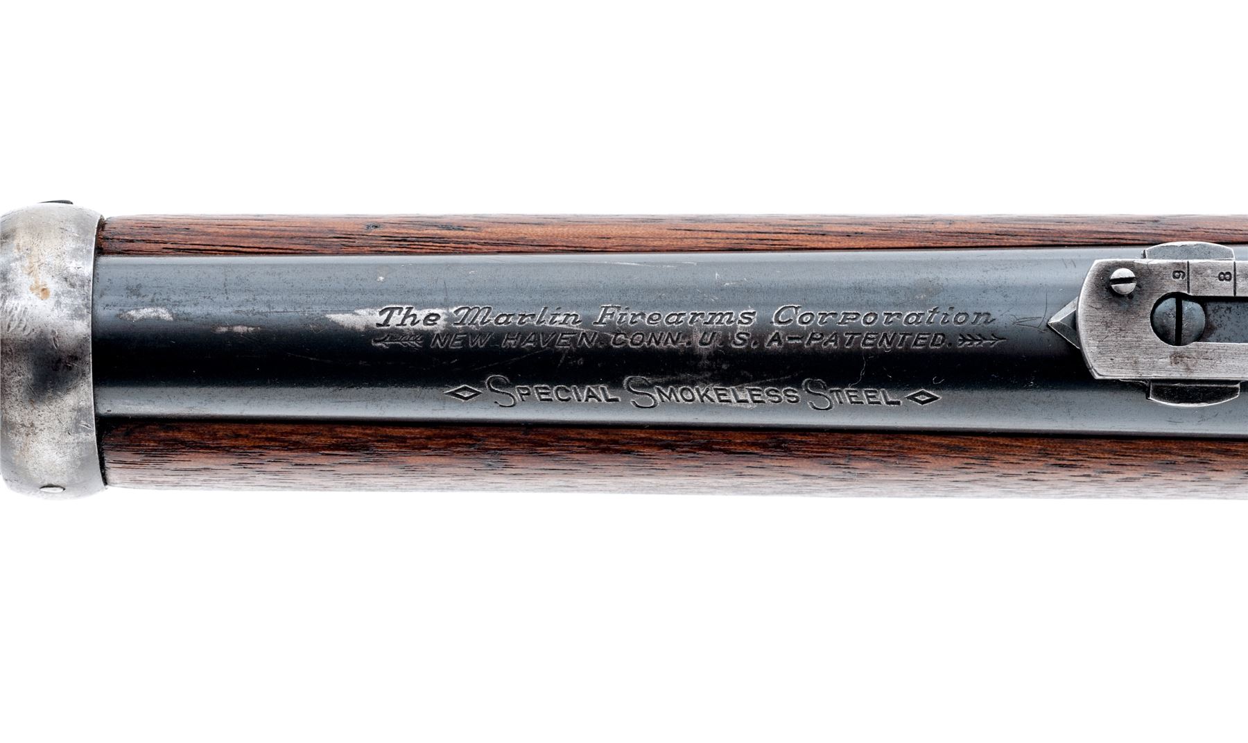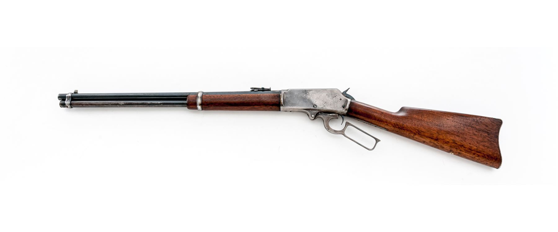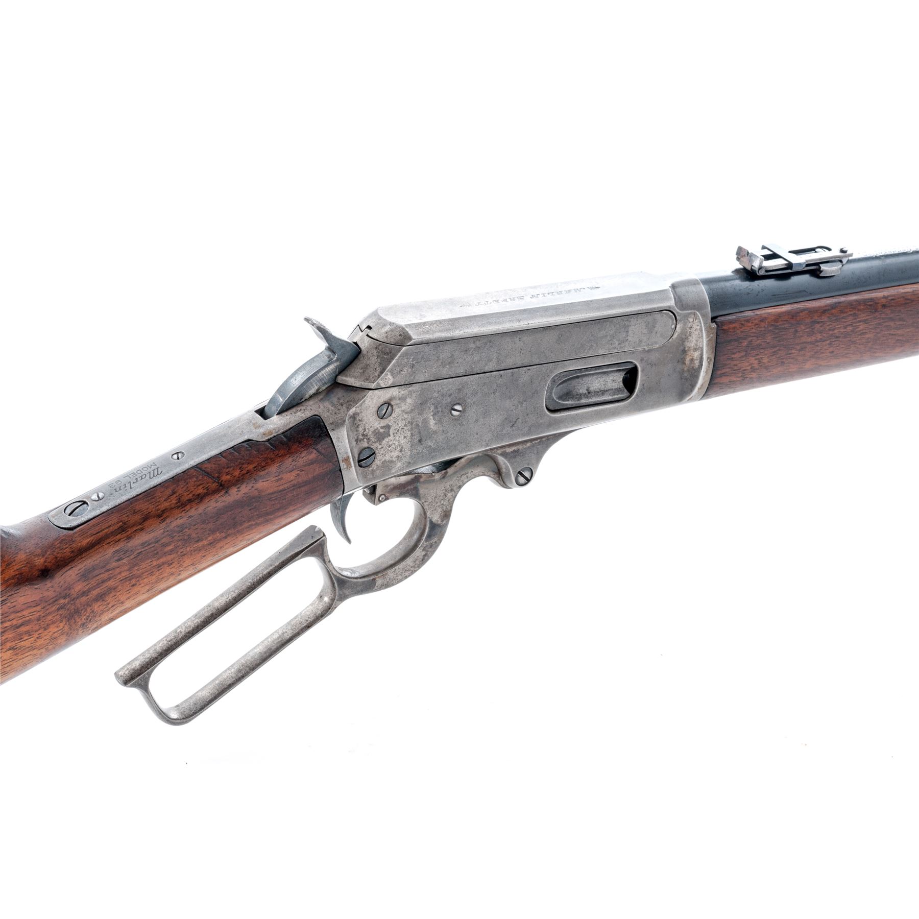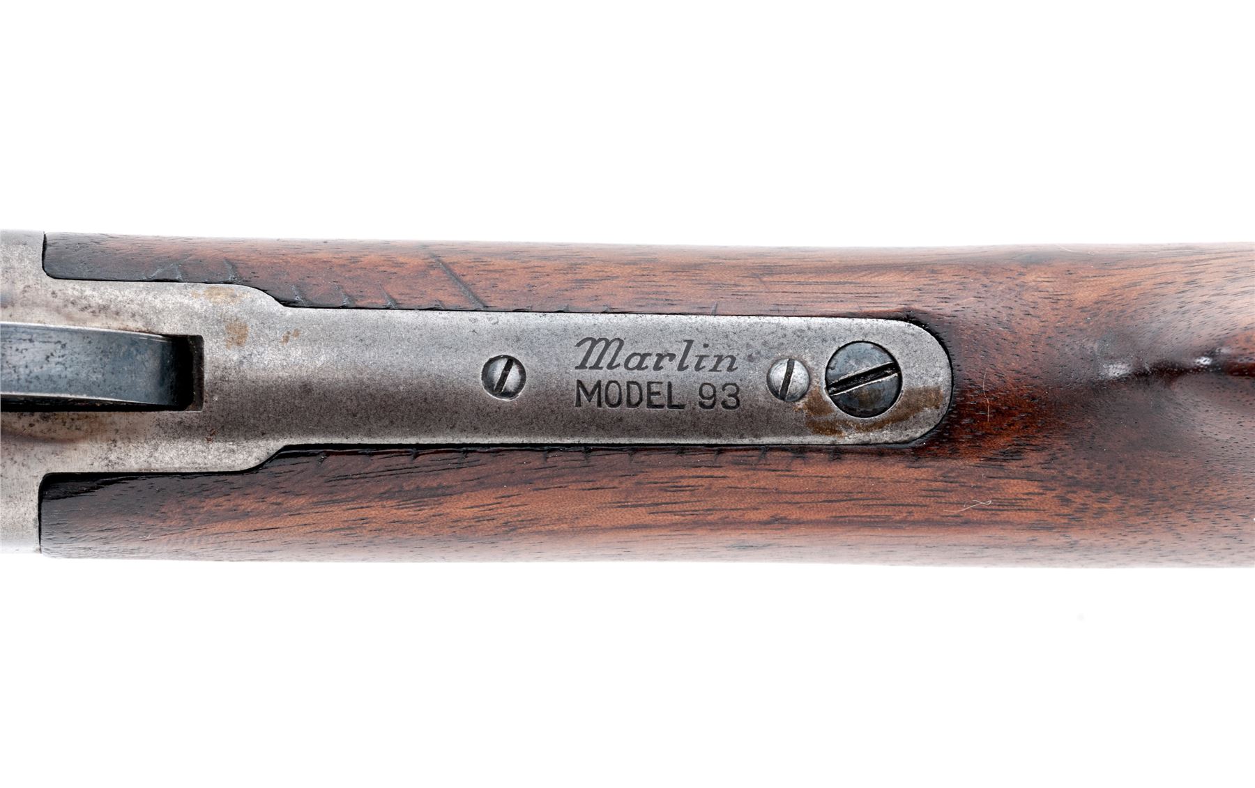 Marlin Model 93 Lever Action Repeating Carbine, #8085, .30-30 CF cal., 20'' round barrel, with block-blade front and adjustable sliding-leaf rear sights, marked with the maker's name, address and ''Special Smokeless Steel'' flanked by diamonds behind the rear barrel band, and ''30-30'' at breech; full-length tubular magazine with retaining band at front sight; solid receiver is marked ''Marlin Safety'' flanked by feather-like brackets, ''Marlin/Model 93'' on top tang, and ''8085'' on bottom tang; loop operating lever; oil-stained walnut forearm and buttstock with carbine buttplate. Mfg'd ca. 1920s-30s. Condition is very good. Barrel retains approx. 80% blue, mag tube 40%, case hardened receiver and buttplate have silvered out, hammer and lever show good case colors. Stocks are sound and smooth showing nice grain and color. Action is currently inoperable; bore is brilliant with shallow rifling. Est.: $350-$550. (C&R)