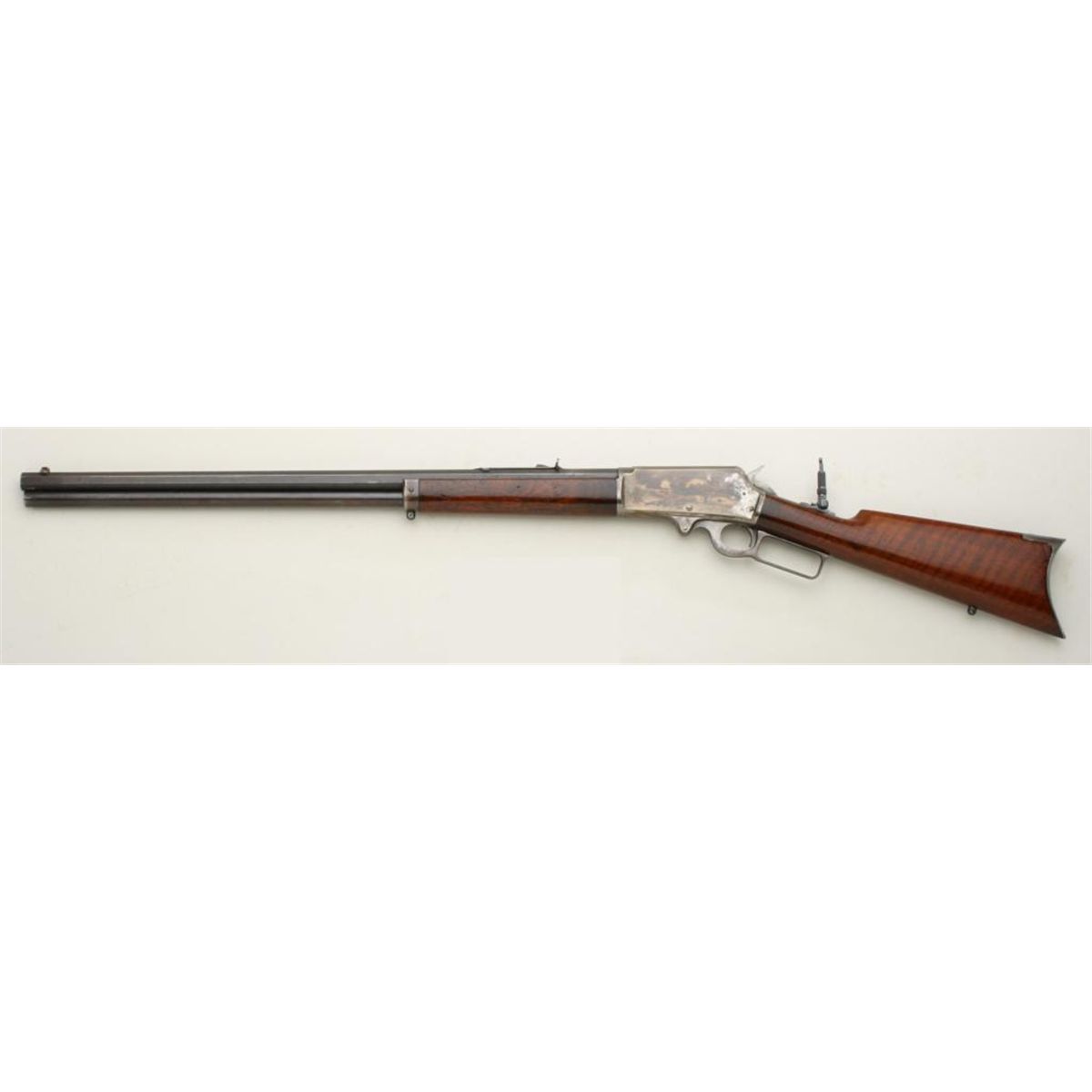 Marlin Model ’93 lever action big frame rifle, .40-65 cal., 26” octagon barrel, blue and case hardened finish, wood stocks, sling swivel eyelets, #263402. This gun is in overall fine condition showing approx. 75%original muted blue finish on barrel, ample traces of original case color on frame and lever with balance gone to silvery color; fine bore, crisp action, sharp markings, adjustable Lyman-type rear folding sight,wood stocks are overall very good showing an old re-finish with beautiful flame graining to the buttstock. Est.: $900-$1,800.