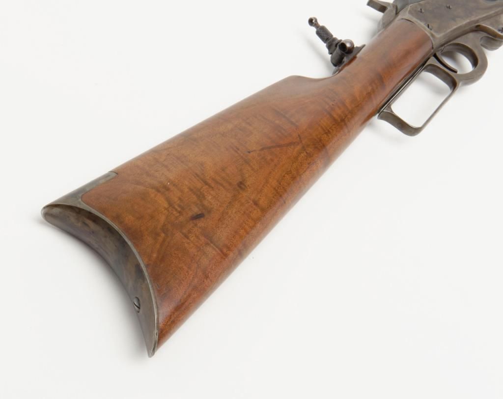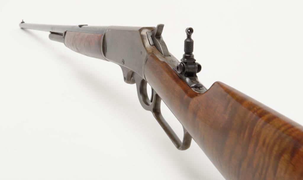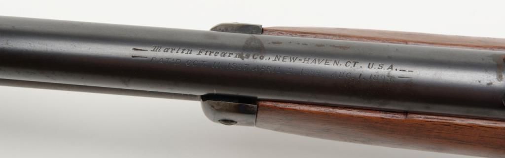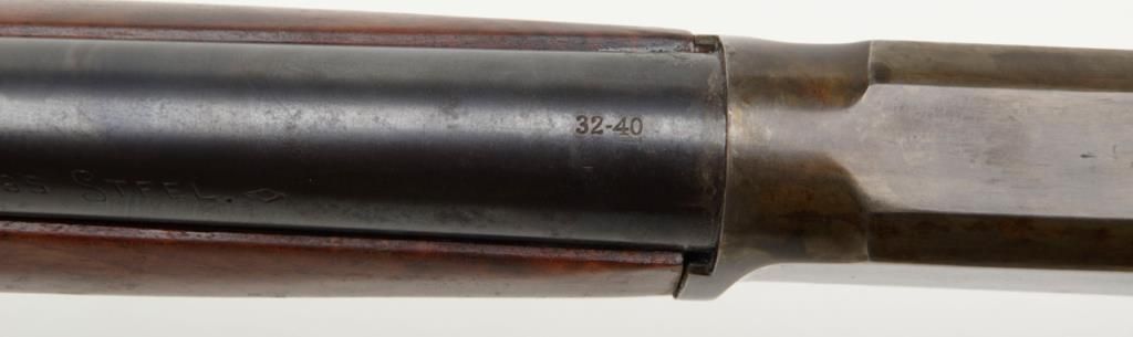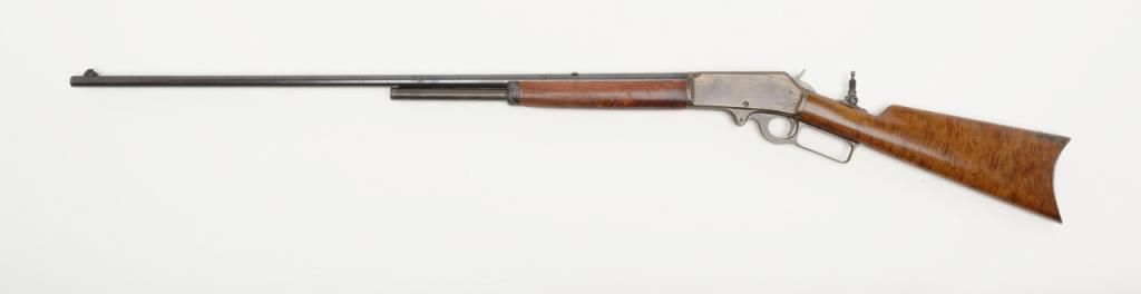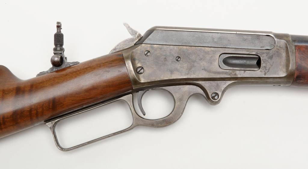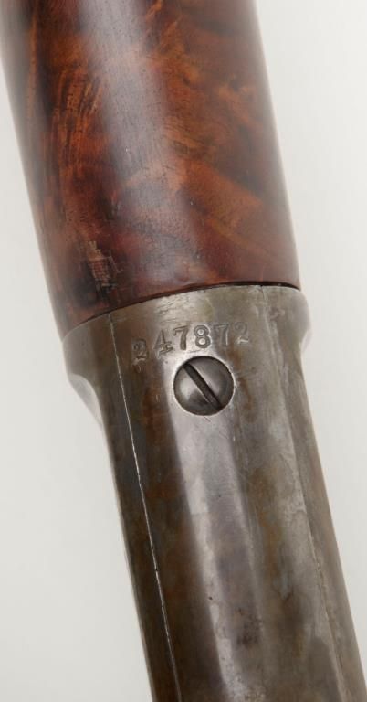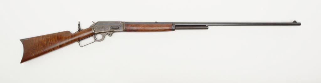 Marlin Model 93 lever action rifle, cal. 32-40 WCF, Serial #247872. The rifle is in overall very good condition with a special order 32” round, blued barrel. The barrel, marked “Special Smokeless Steel”, retains approximately 70% of its blued finish with some scattered surface erosion and toning, while the ¼ magazine has gone to a light patina. The rifle has been re-stocked with high grade walnut showing significant fiddleback graining in the butt stock. The rifle shows aconsiderable amount of muted case color to the action, lever, hammer and metal crescent butt plate. The bore is good and may clean to very good, action is crisp and markings still sharp. The rear sight has been removed and plugged whilea period tang sight has been added. (C+R/PPT). Est.: $1,500-$3,000.