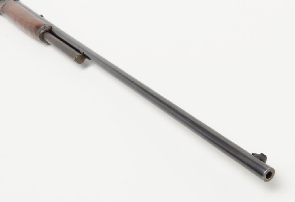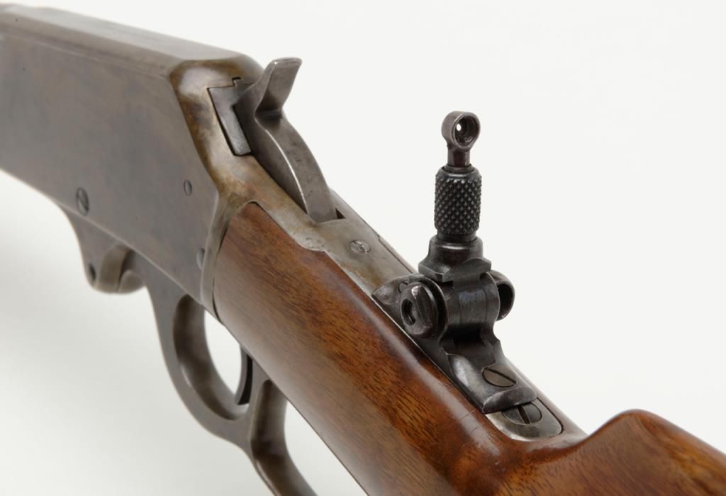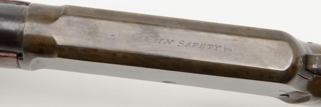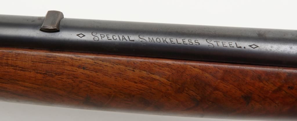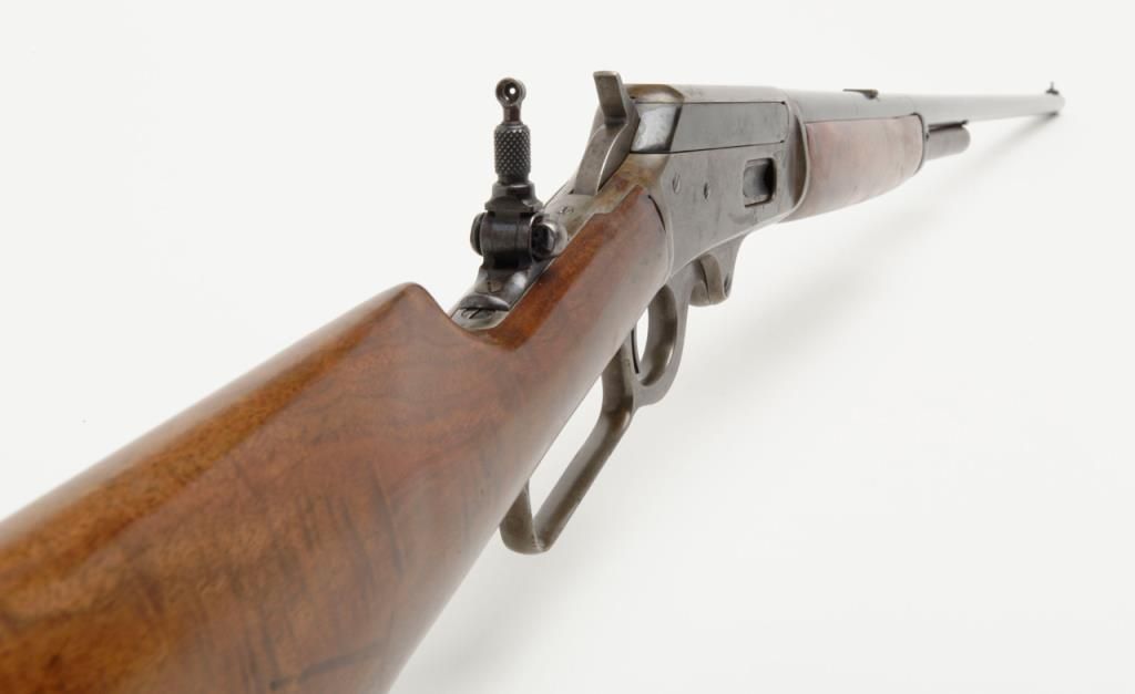 Marlin Model 93 lever action rifle, cal. 32-40 WCF, Serial #247872. The rifle is in overall very good condition with a special order 32” round, blued barrel. The barrel, marked “Special Smokeless Steel”, retains approximately 70% of its blued finish with some scattered surface erosion and toning, while the ¼ magazine has gone to a light patina. The rifle has been re-stocked with high grade walnut showing significant fiddleback graining in the butt stock. The rifle shows aconsiderable amount of muted case color to the action, lever, hammer and metal crescent butt plate. The bore is good and may clean to very good, action is crisp and markings still sharp. The rear sight has been removed and plugged whilea period tang sight has been added. (C+R/PPT). Est.: $1,500-$3,000.