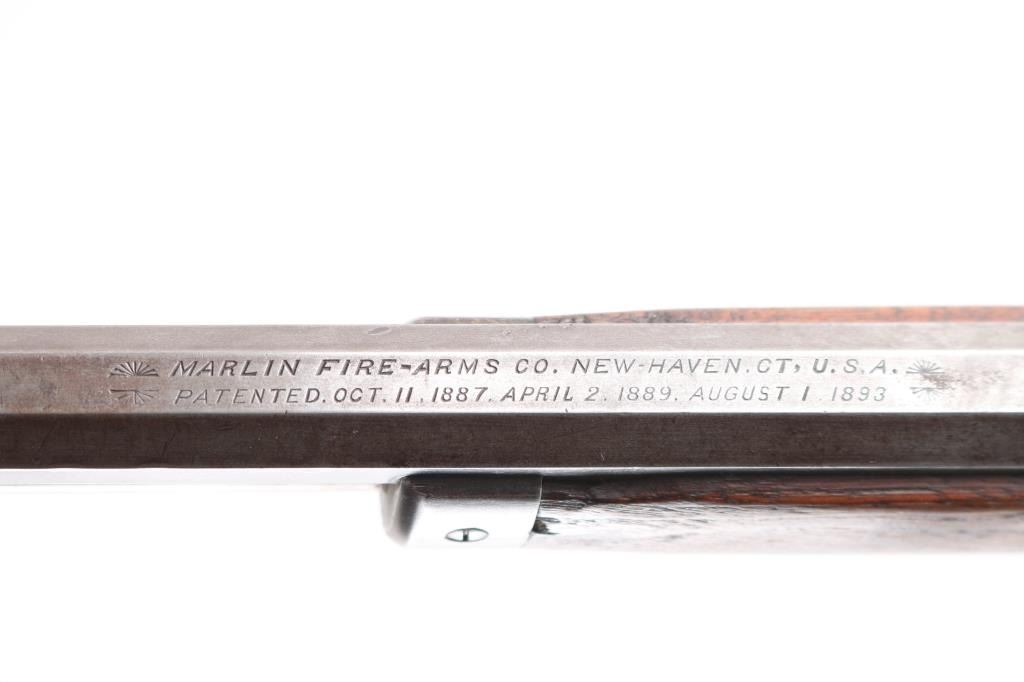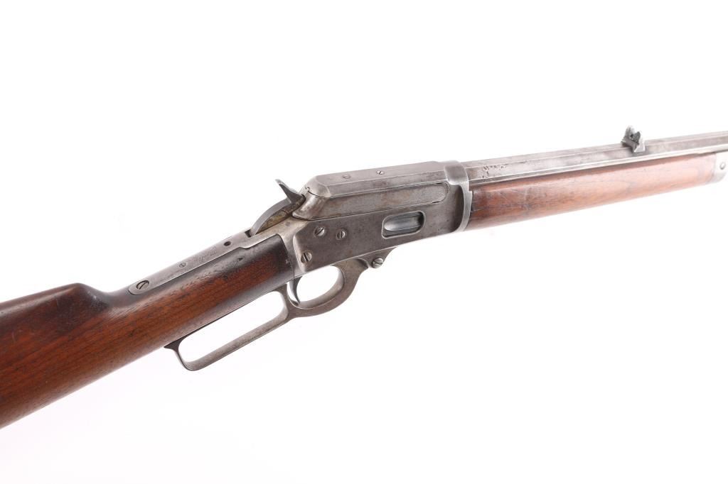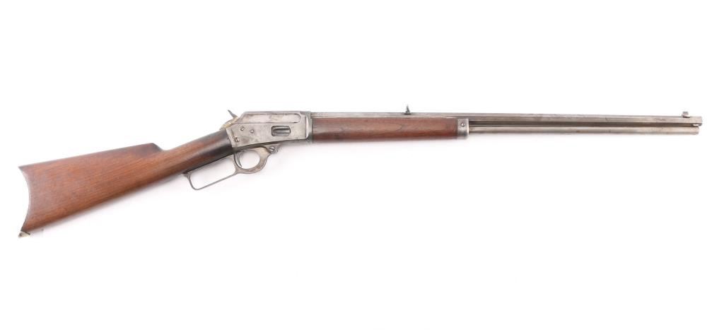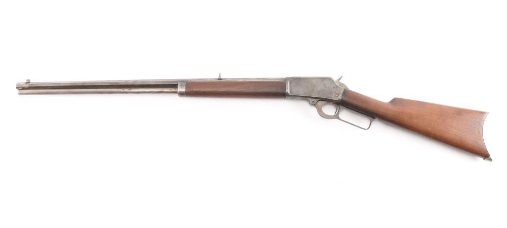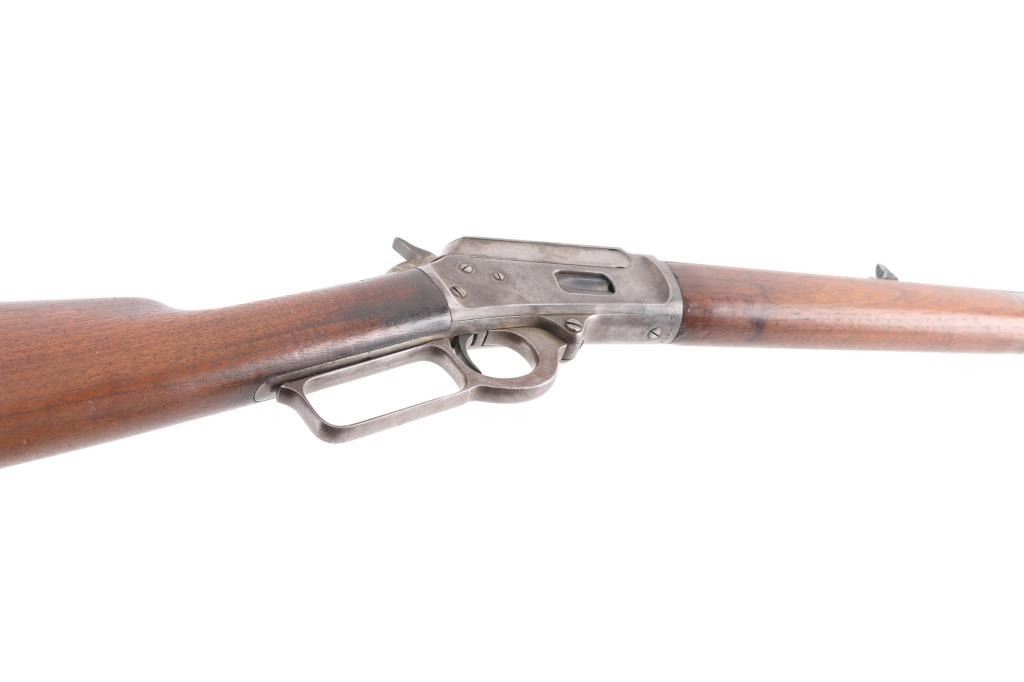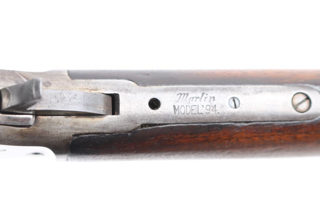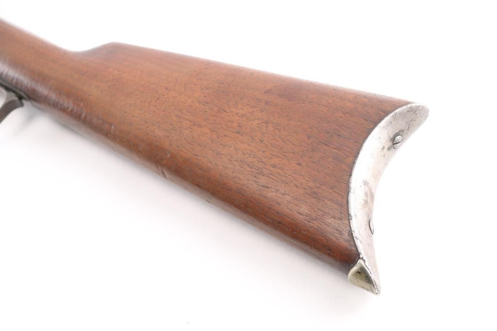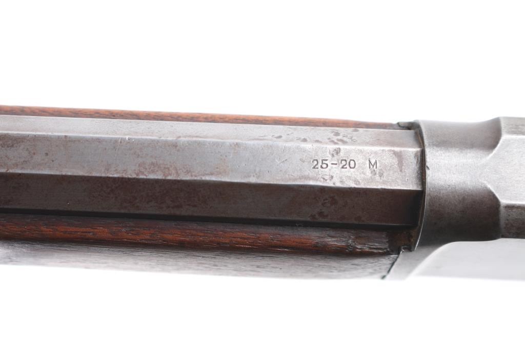 Rare caliber. Lever action rifle manufactured circa 1894-34. Features blued finish, straight gripped two piece stock, curved steel buttplate, 24" octagonal barrel, blade/bead front, fixed non factory high v-notch sight in rear dovetail, appears to be home made, full length magazine tube. Bore is rough/pitted, with shallow rifling, Metal finish is in the white with some scattered pin-prick pitting, action is smooth, wood is good/sound with minor scratches/dings, a rounded piece of metal has sodered to the lower buttplate to protect the toe.
