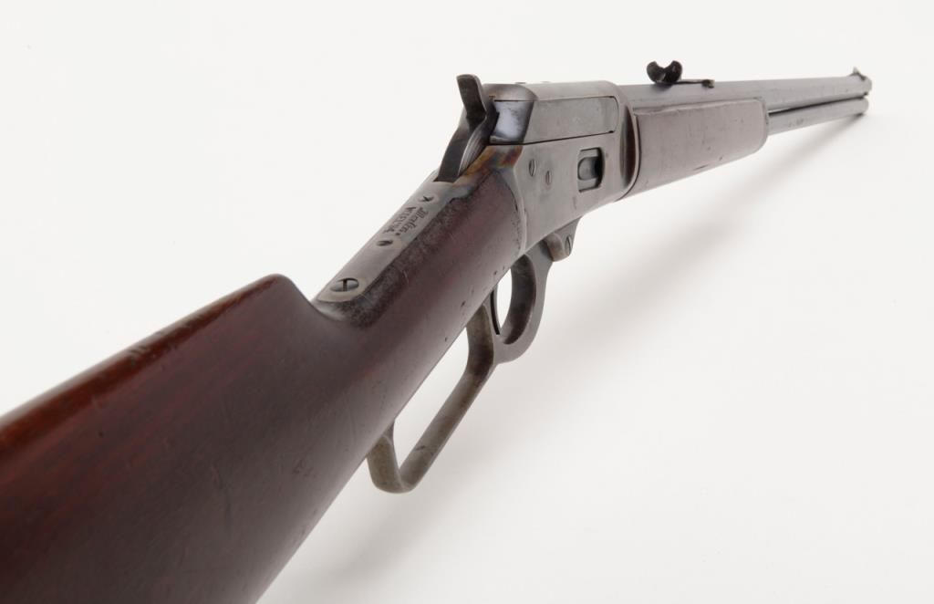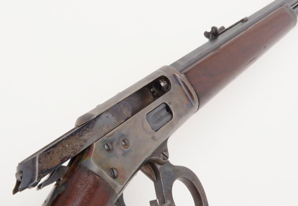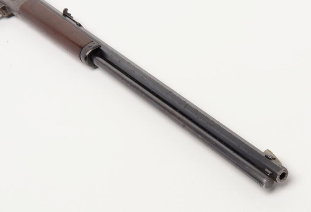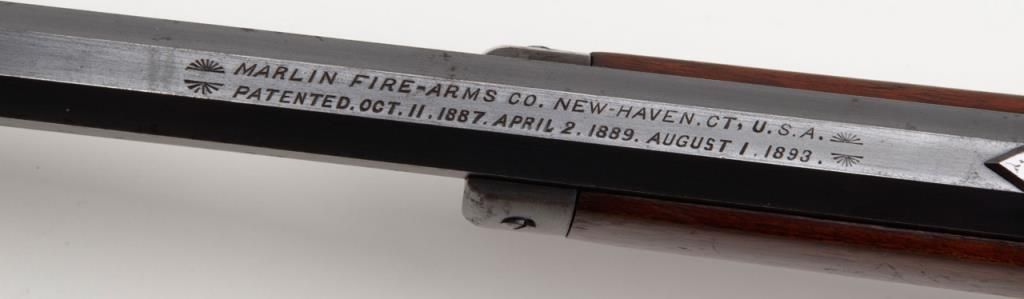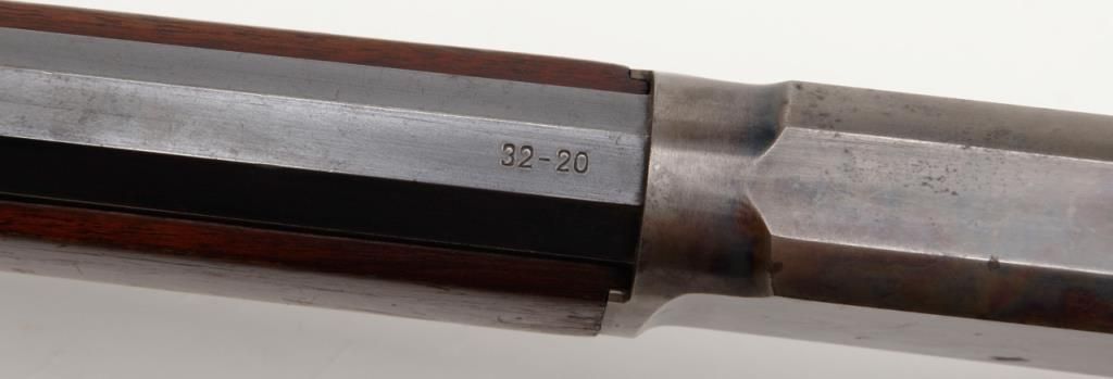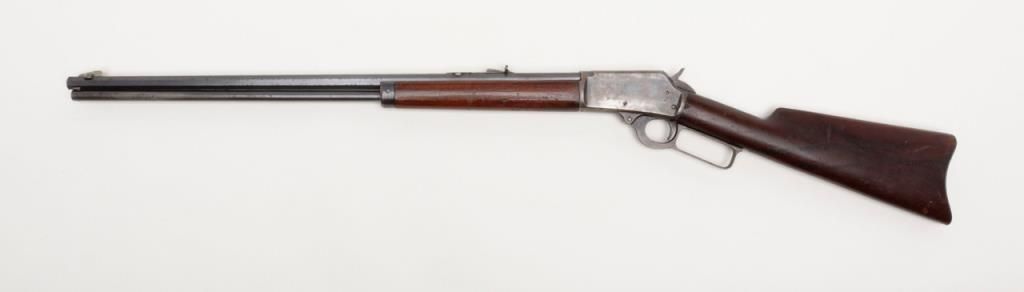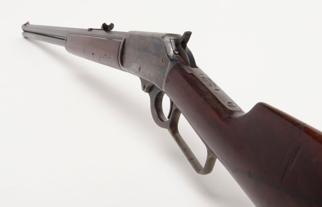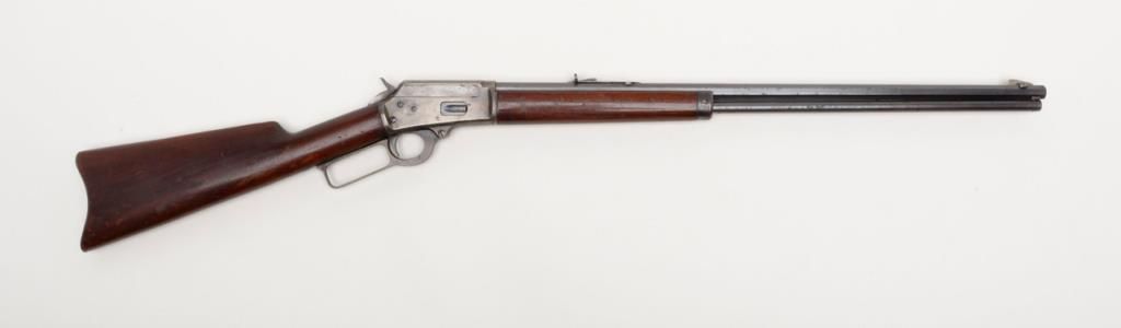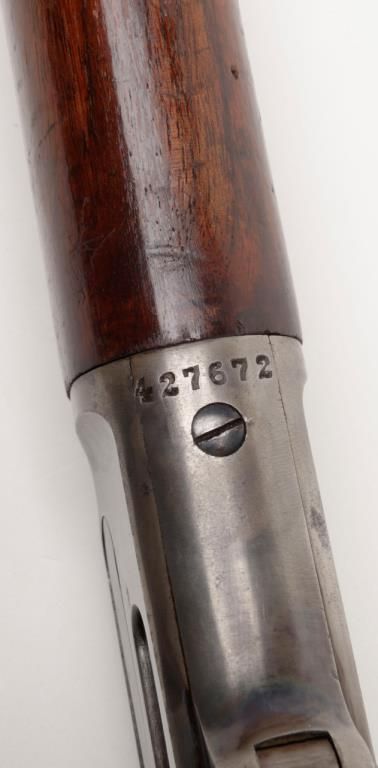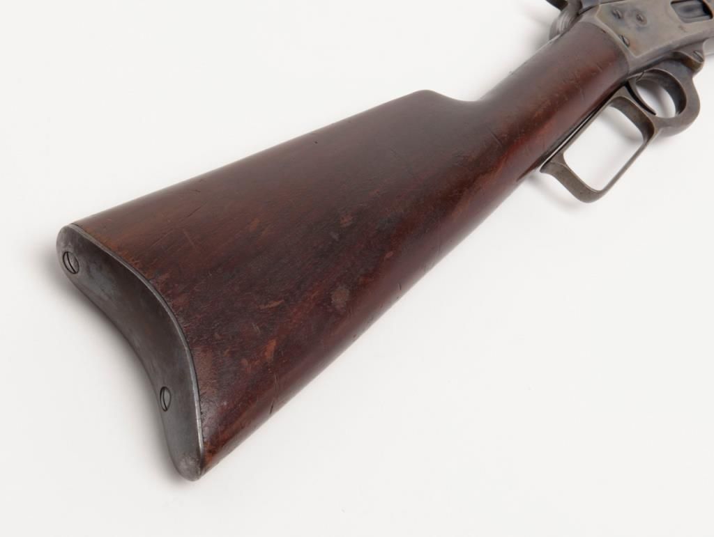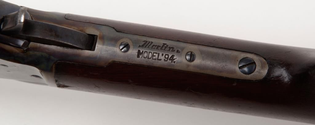 Marlin Model 94 lever action rifle, cal. 32-20, Serial #427672. The rifle is in overall very good to nearly fine condition. The 24" octagonal barrel has sharp edges, buckhorn rear sight, silver blade front sight and retains approximately 80% of original barrel blue. The loading tube shows loss of finish and moderate surface erosion while the stocks are in good condition showing scars, mars and compressions in addition to an old coat of varnish added. The rifle ends in acrescent, metal butt plate. The action, lever and hammer show a significant amount of bright case color and the bore is very good. A most acceptable Marlin lever gun. (C+R/PPT). Est.: $1,000-$2,000.