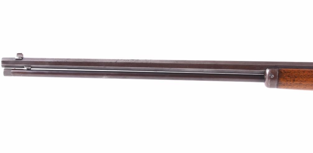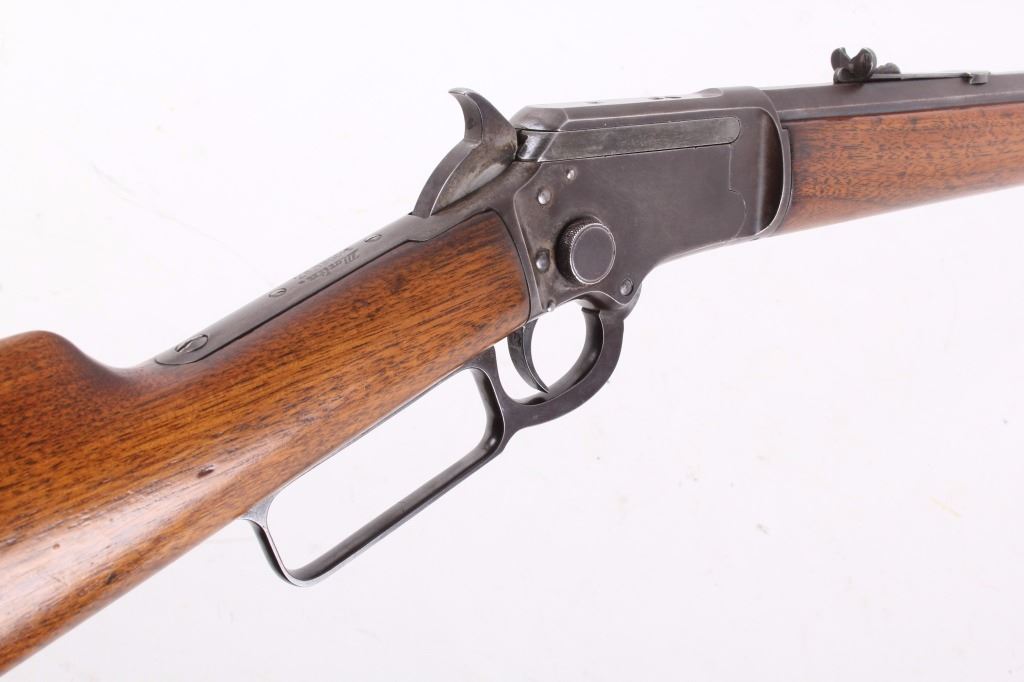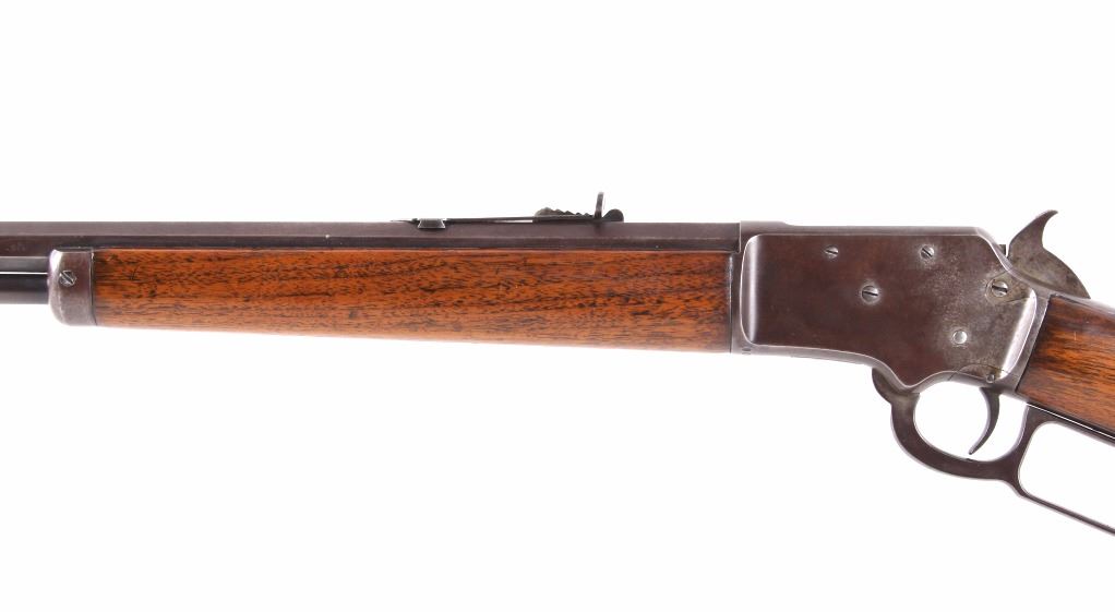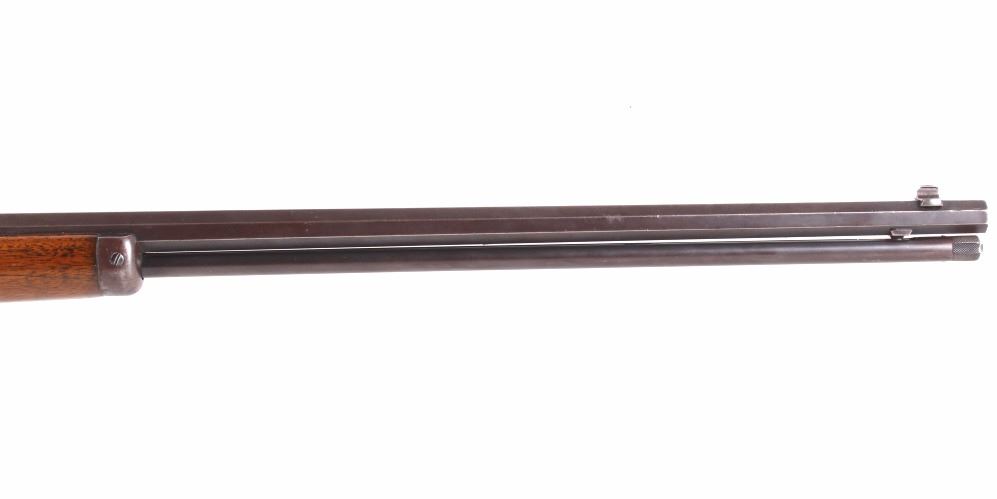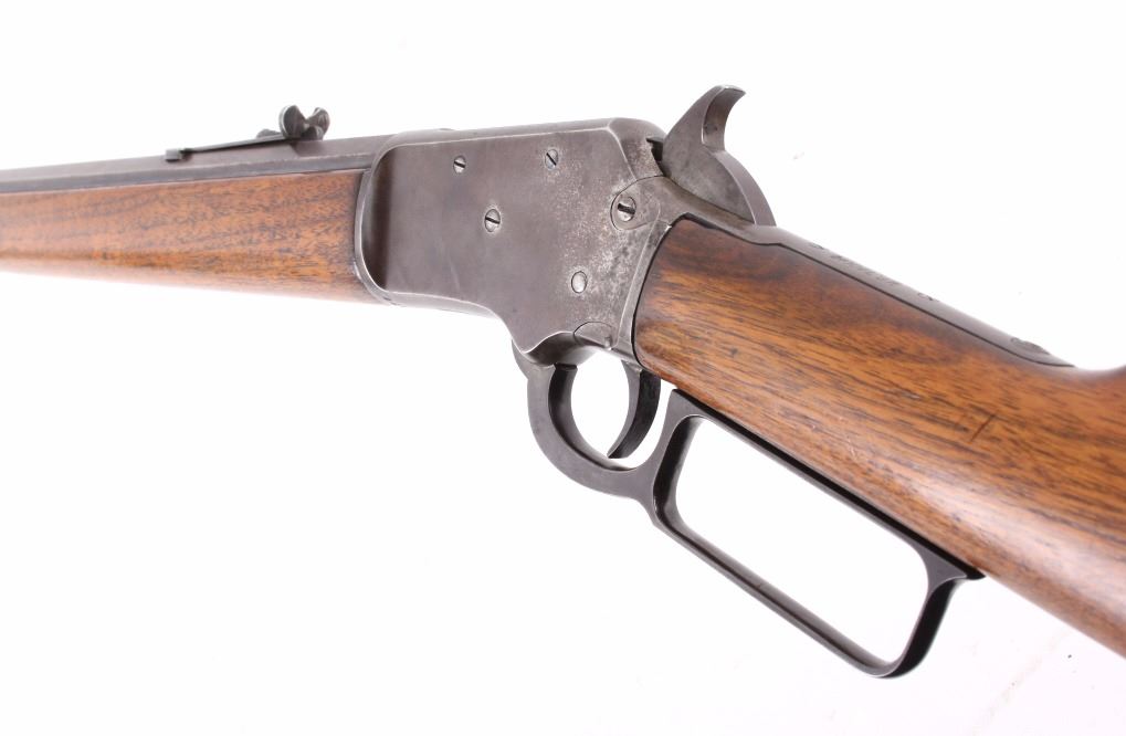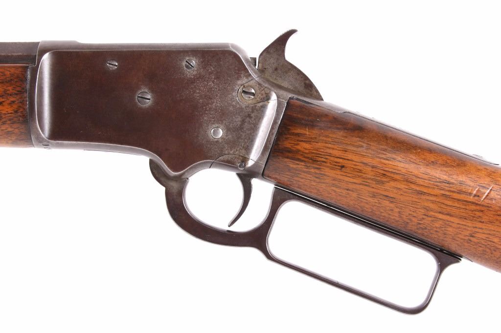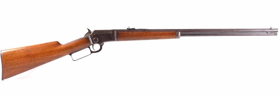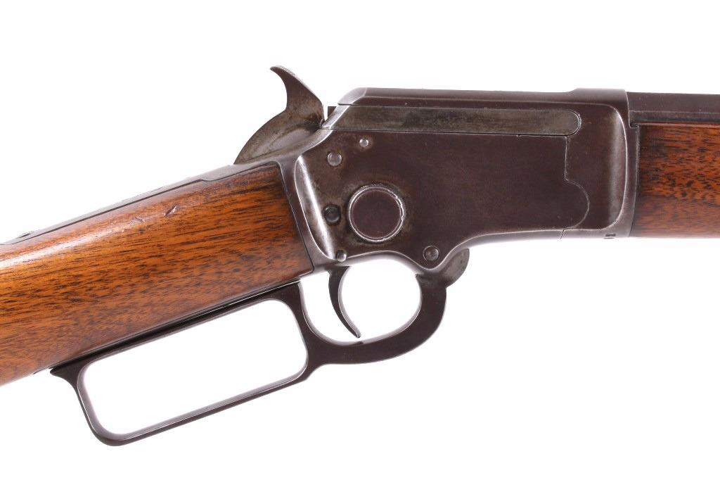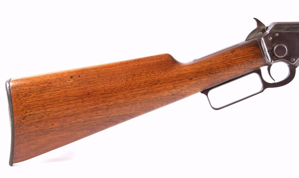 This is a fine example of a Marlin Model 97 .22 LR octagon barrel lever action rifle. This rifle features a blued finish, straight grip walnut stock, and 24" octagon barrel. This rifle was an improvement on the Model 1892 design, the Marlin Model 1897 rifle was available only as a takedown model and only in .22 rimfire. The rifle is marked on the barrel "Marlin Firearms Co. New Haven, CT, U.S.A Pat'd Nov.19 1887. April 2 1889. Aug. 12 1890, Mar. 1 1892." The rifle is also marked on the tang "Marlin Model '97. This rifle shows good condition, but with much loss to the bluing. The stock and the forearm show few dings and an overall good condition. Functions well and smoothly. Curio & Relic rifle. FFL transfer or NICS background check required. Serial number is 39153. Overall length is 40 1/4"