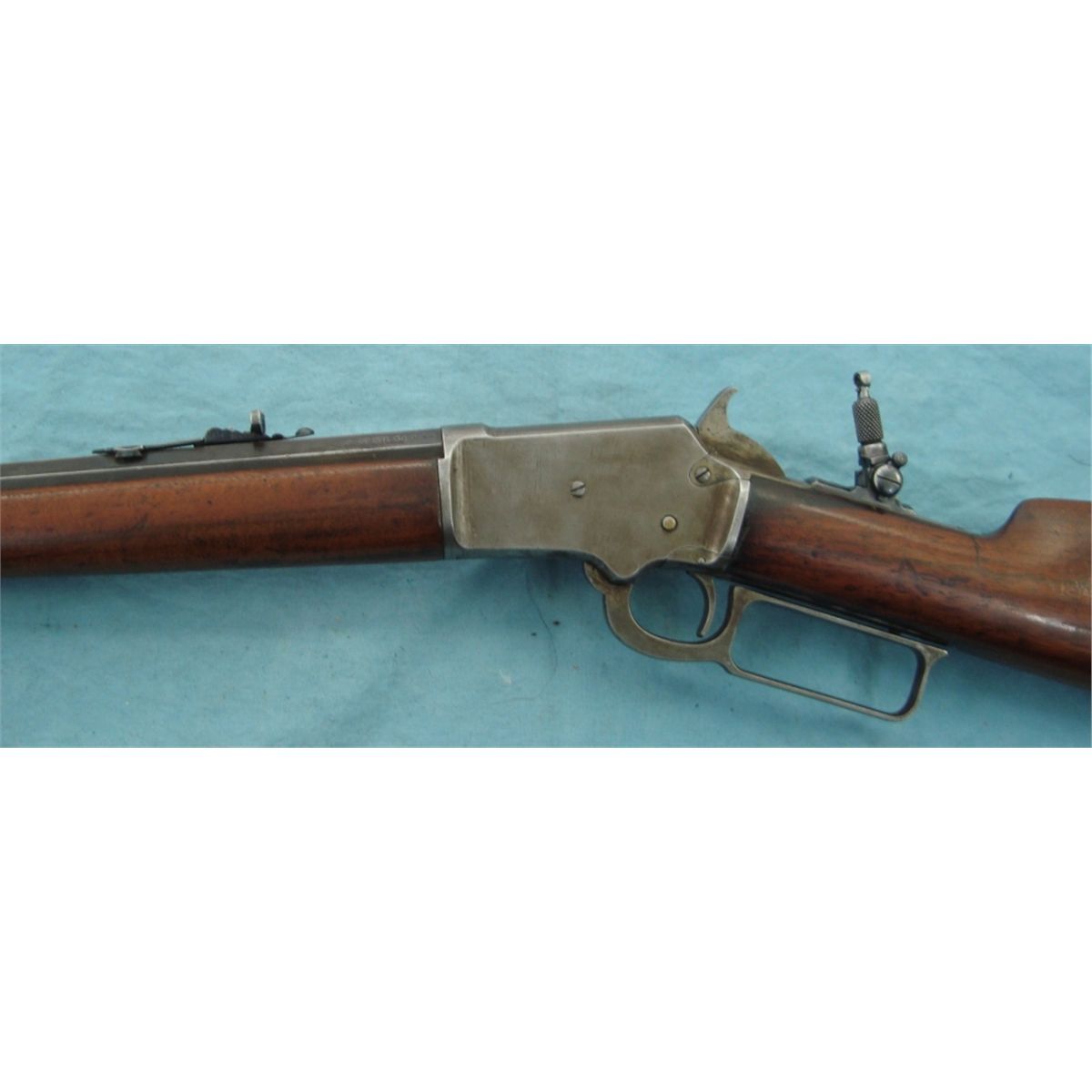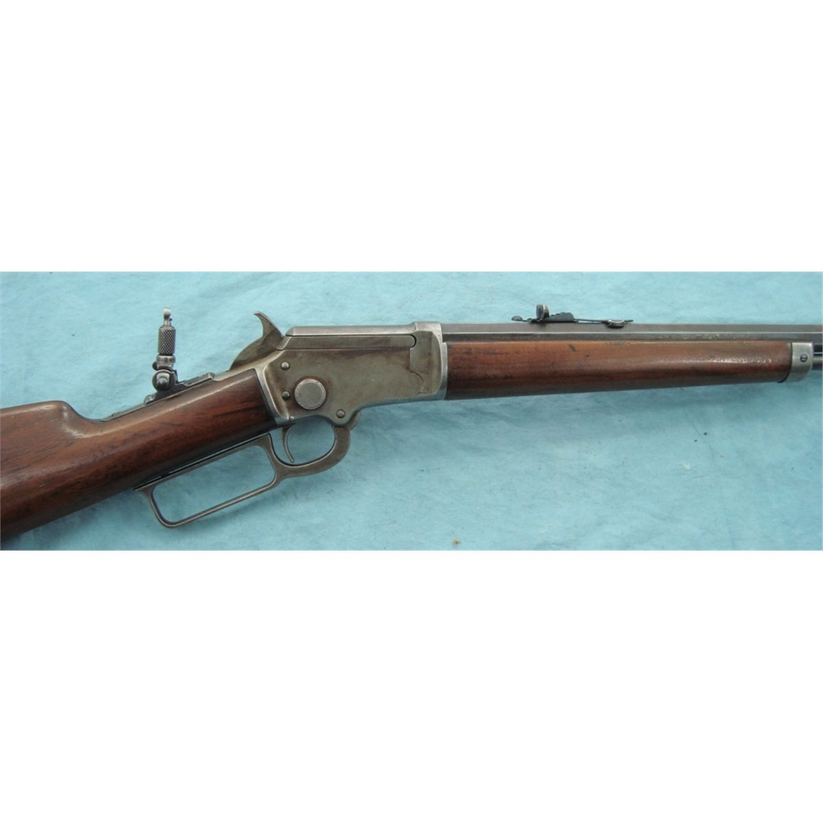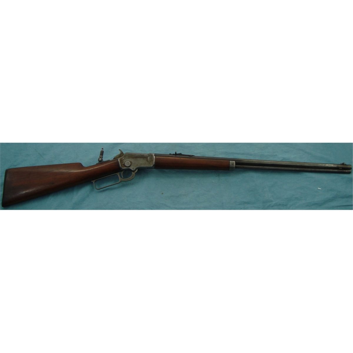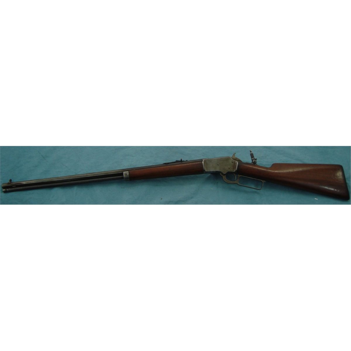 #231717; 22 cal. w/24" oct. bbl. Flip up front sight & rear peep sight. Blued bbl. fading to brown & case colored receiver fading to silver. Good wood stock w/replacement Marlin butt plate. Mechanically gun seems good. Bore may have been relined, see photo.