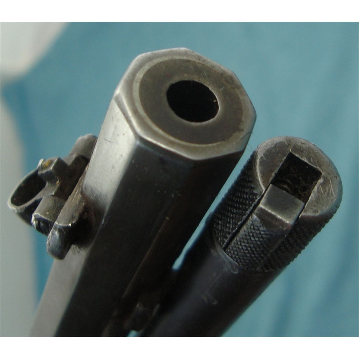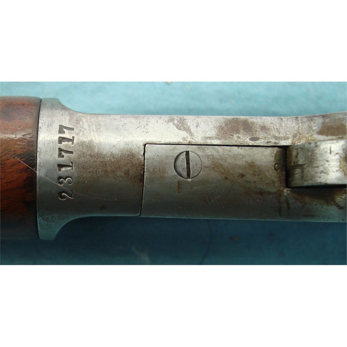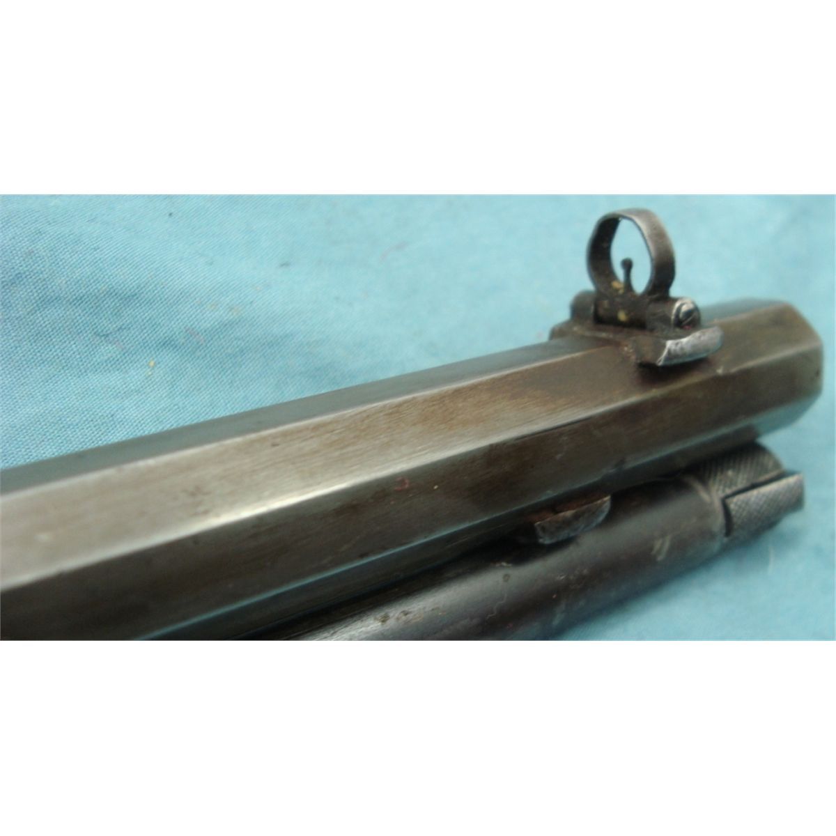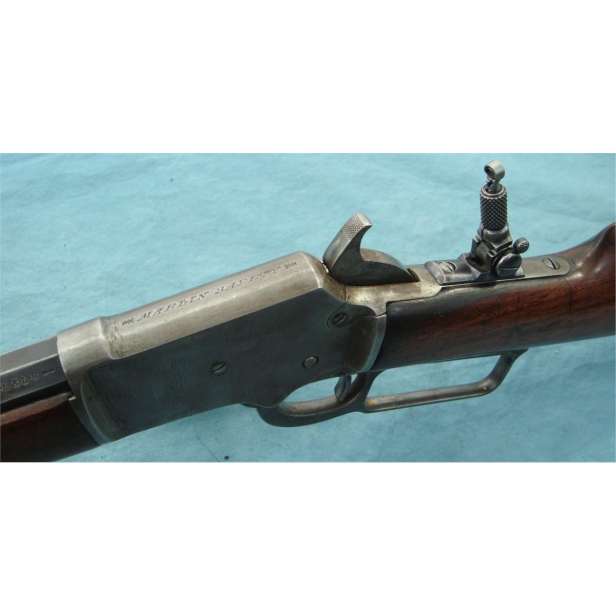 #231717; 22 cal. w/24" oct. bbl. Flip up front sight & rear peep sight. Blued bbl. fading to brown & case colored receiver fading to silver. Good wood stock w/replacement Marlin butt plate. Mechanically gun seems good. Bore may have been relined, see photo.