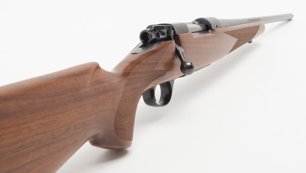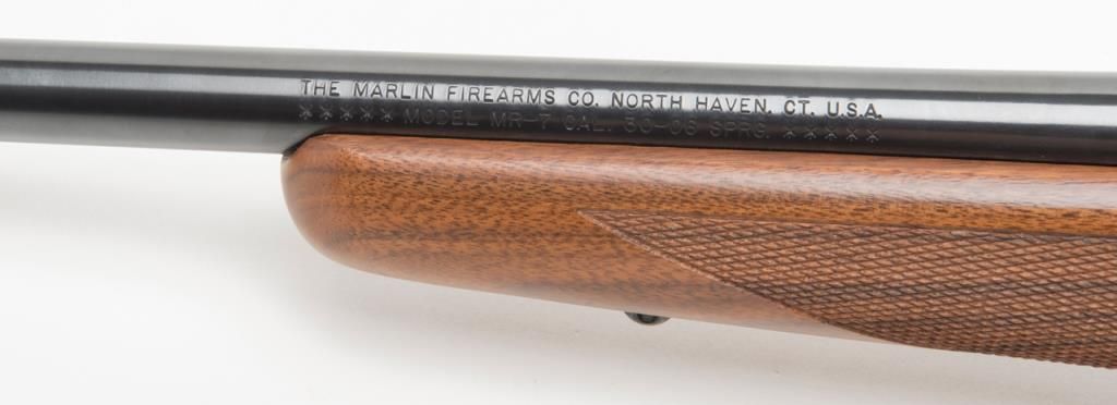 Marlin Model MR-7 bolt action rifle, .30-06 Springfield cal., 22” barrel, blue finish, checkered wood stock, receiver tapped for scope mount, Marlin hard rubber butt pad, #04000436 in overall fine condition showing little use; smallstorage ding on lower left rear side of butt stock and a couple slight scratches on left side by trigger assembly; accompanied by factory cardboard box. (Modern). Est.: $200-$400.