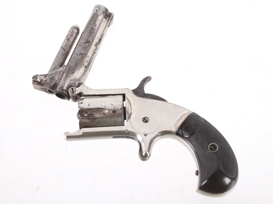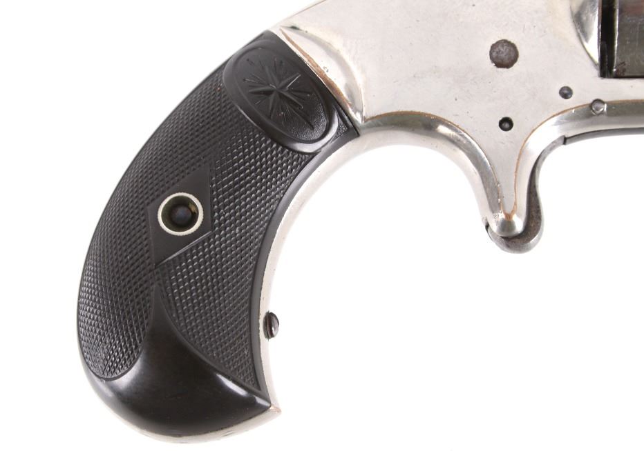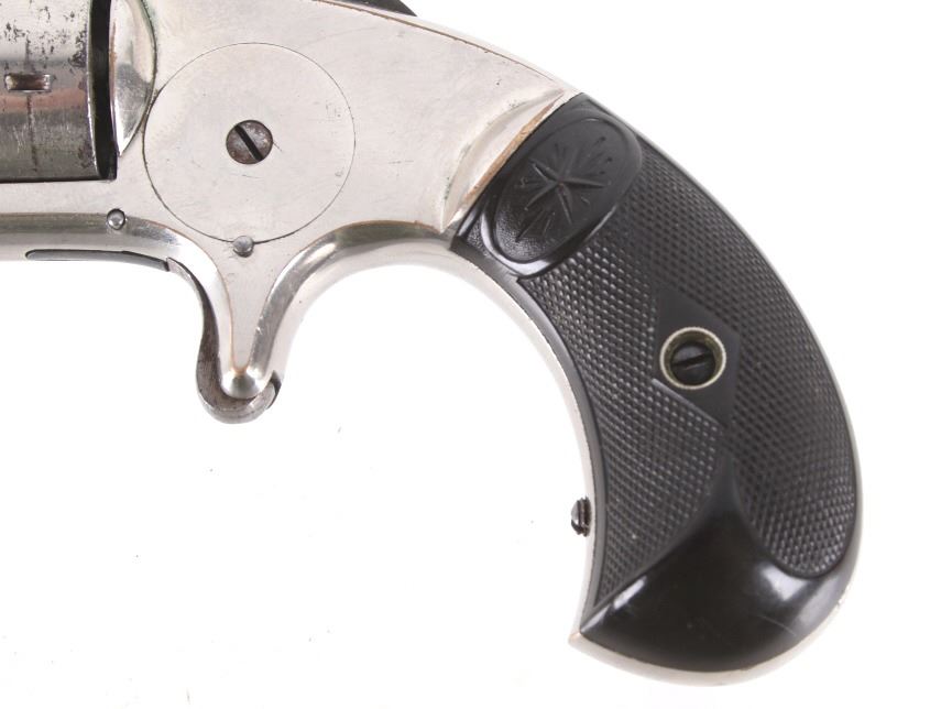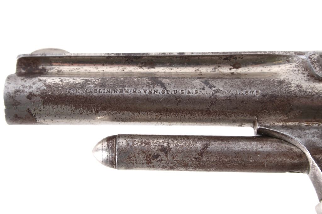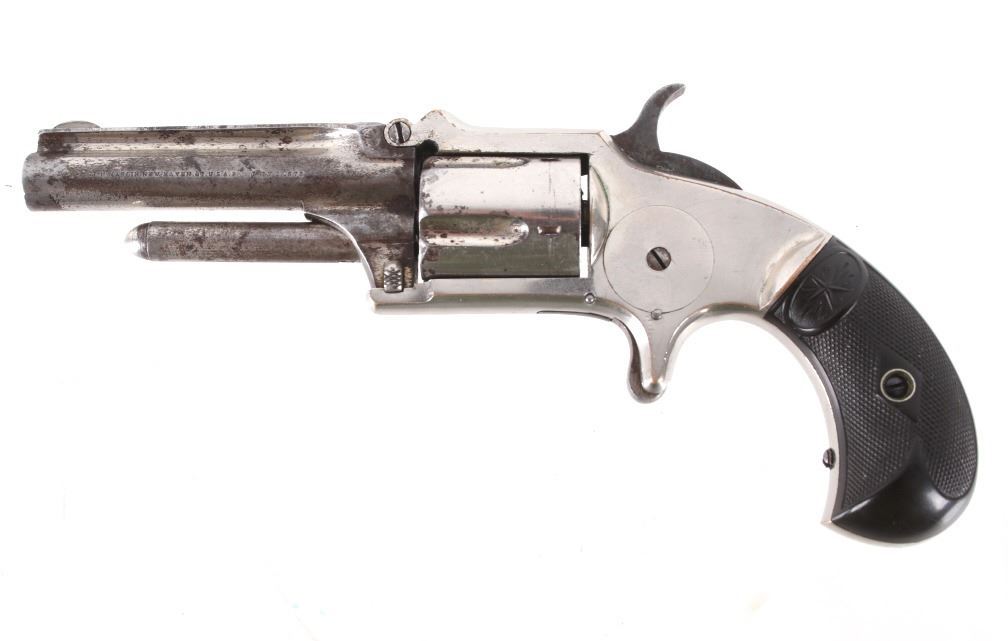 Featured in this lot is a Marlin number 32, standard 1875 nickel plated, single action revolver chambered in .32 caliber. The Marlin number 32 is a nickel plated, single-action, top-break revolver produced by J. M. Marlin. This nickel-plated pistol is in good condition, with much of the finish being retained. This revolver is chambered in .32. The barrel measures 3" long and features black checkered rubber grips. The top of the barrel is marked "No. 32 Standard 1875", with the side of the barrel marked "J. M. Marlin, New Haven, CT, U.S.A. Pat. July 1, 1878." The firearm is in good mechanical condition and has a tight action. Serial Number 3350. This firearm qualifies as an Antique, and does not require FFL Transfer or NICS Background Check.