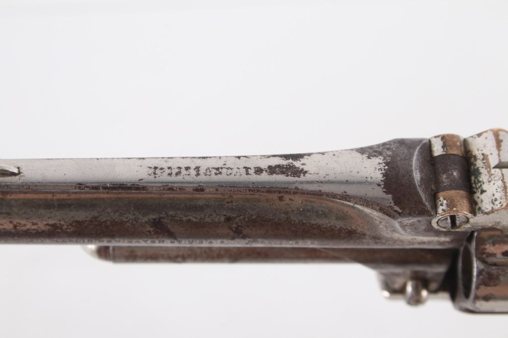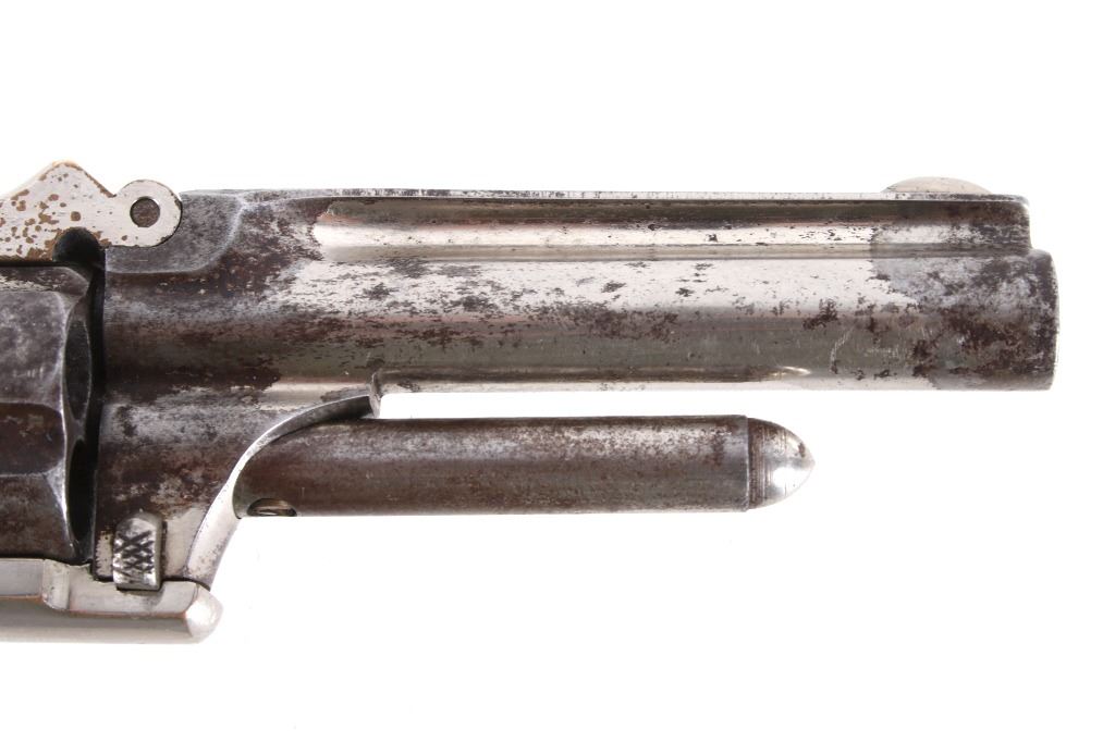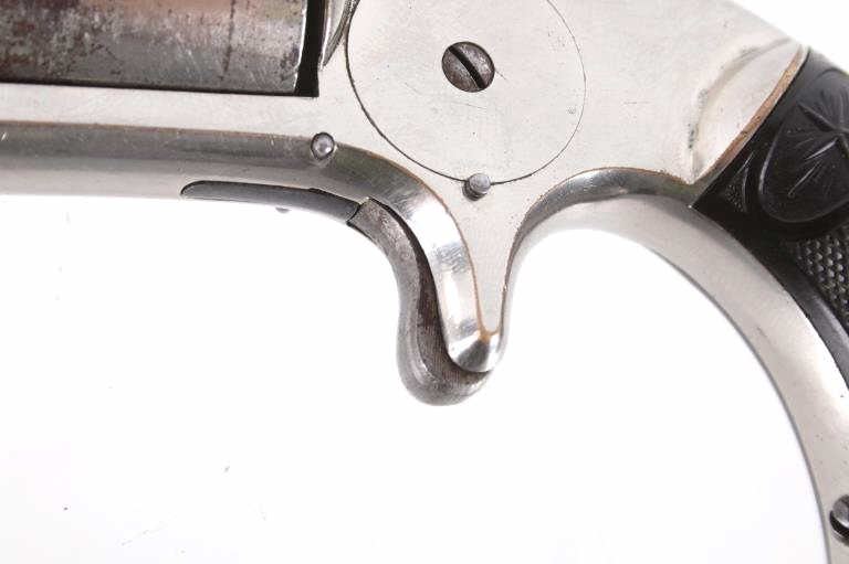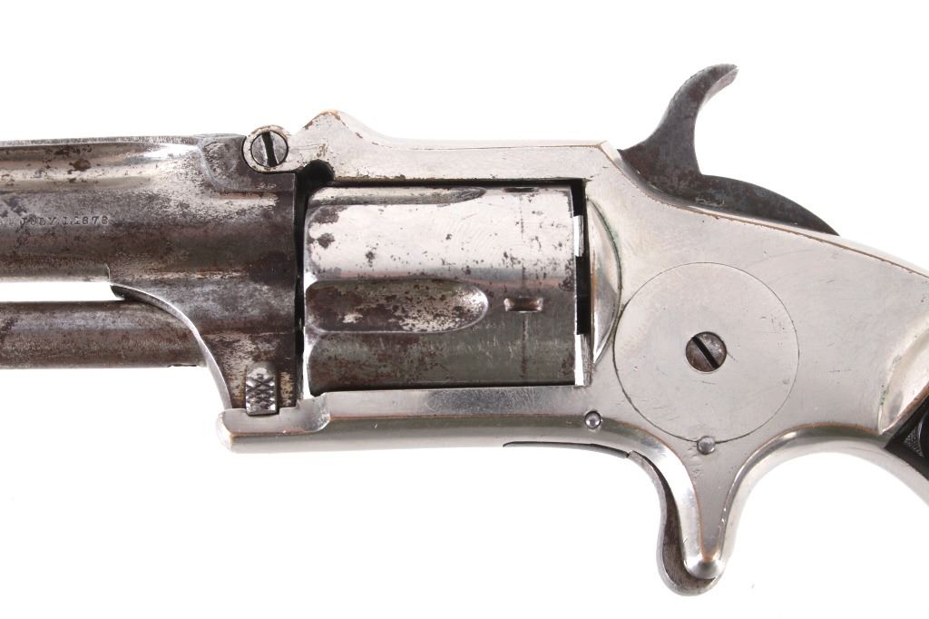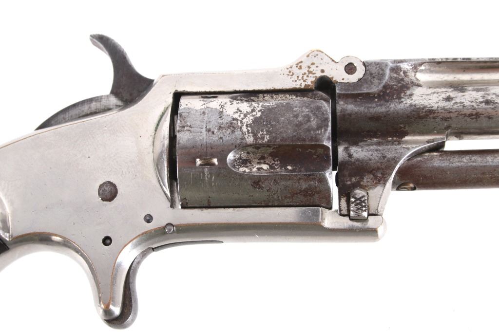 Featured in this lot is a Marlin number 32, standard 1875 nickel plated, single action revolver chambered in .32 caliber. The Marlin number 32 is a nickel plated, single-action, top-break revolver produced by J. M. Marlin. This nickel-plated pistol is in good condition, with much of the finish being retained. This revolver is chambered in .32. The barrel measures 3" long and features black checkered rubber grips. The top of the barrel is marked "No. 32 Standard 1875", with the side of the barrel marked "J. M. Marlin, New Haven, CT, U.S.A. Pat. July 1, 1878." The firearm is in good mechanical condition and has a tight action. Serial Number 3350. This firearm qualifies as an Antique, and does not require FFL Transfer or NICS Background Check.