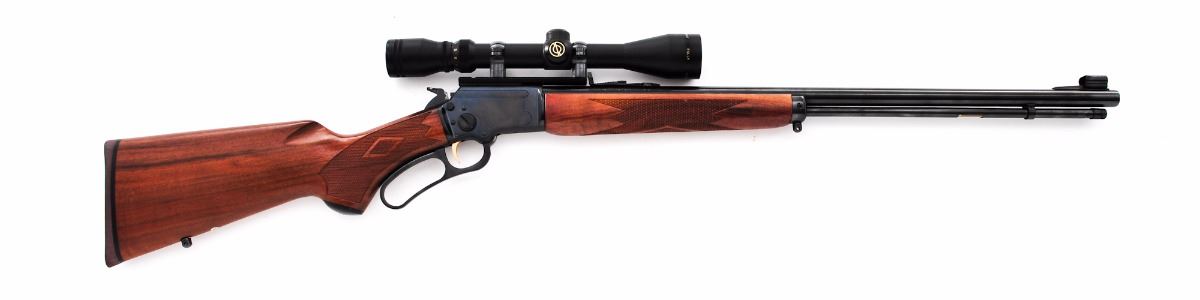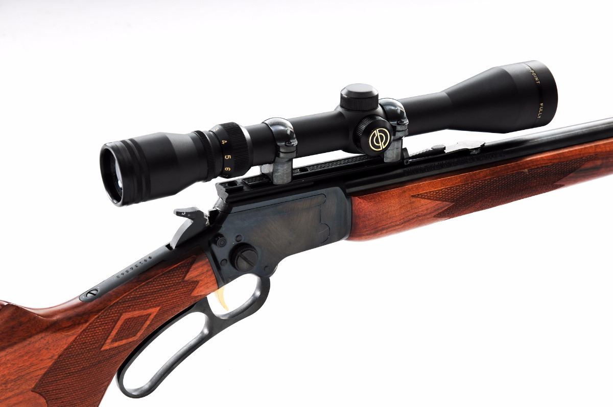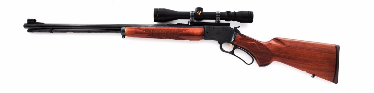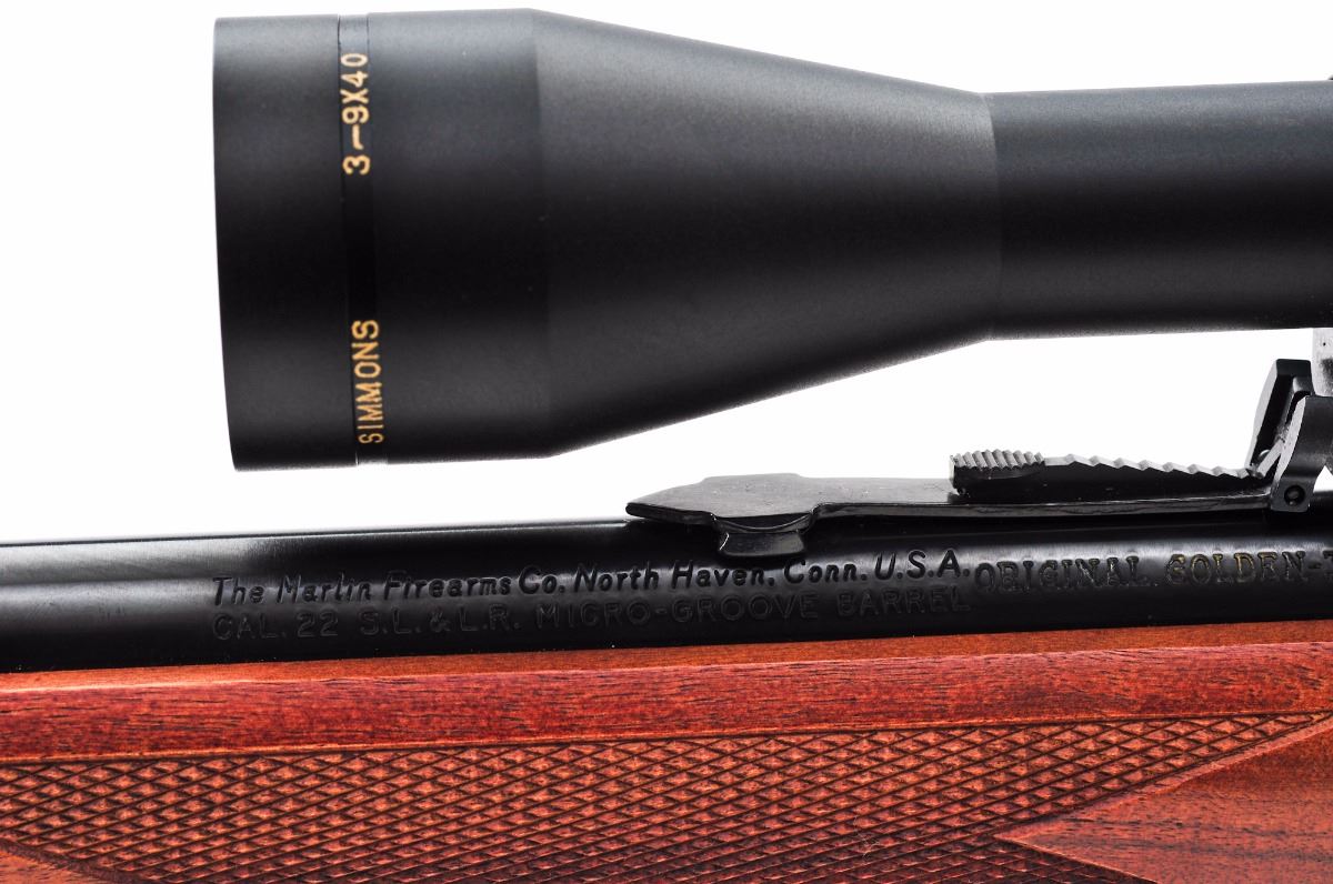 Marlin Original Golden-39A Lever Action Rifle, #99136862, .22 S-L-LR cal., 24'' round micro-groove barrel, checkered with diamond pattern pistol-grip walnut stock and forend, hooded brass bead front sight, folding semi-buckhorn rear sight, factory brown hard rubber Marlin buttplate, with gold-plated trigger and sling swivel studs. Topped with a Simmons 3-9x40 8-Point scope on one-piece cantilever scope base. Condition is excellent retaining approx. 98%-99% blue with fine micro-scratching to receiver, as well as general light marks from handling to barrel, stock and forend. Hammer shows some wear and impressions to top edge. Scope rings with trace amounts of surface rust where scope and rings meet. Checkering remains sharp, action is crisp, bore is excellent, scope optics are bright and clear. Est.: $350-$500. (Modern)