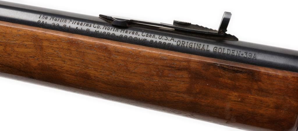 *Marlin Original Golden Model 39A lever action rifle, .22 short, long & LR caliber, 24” round barrel, S/N 23250038, blued finish, wood stocks in overall fine condition. Est.: $325-$650.