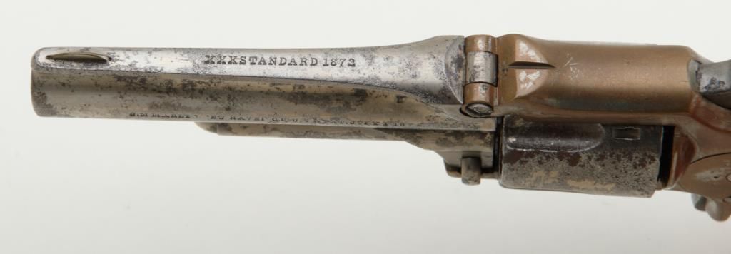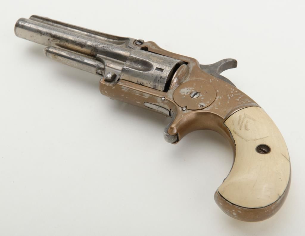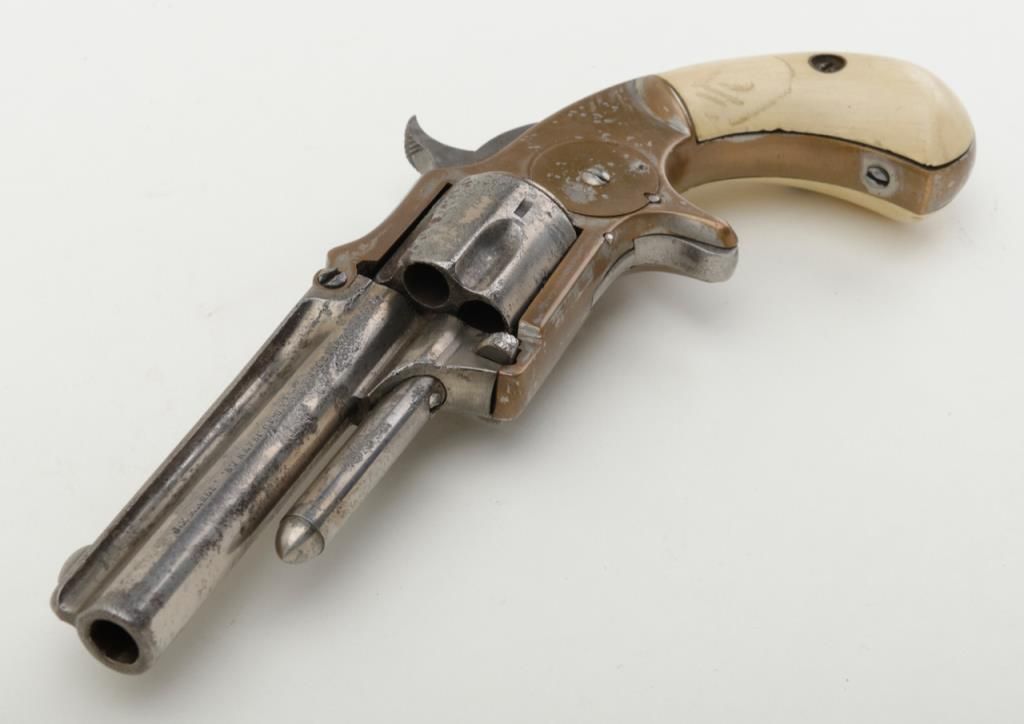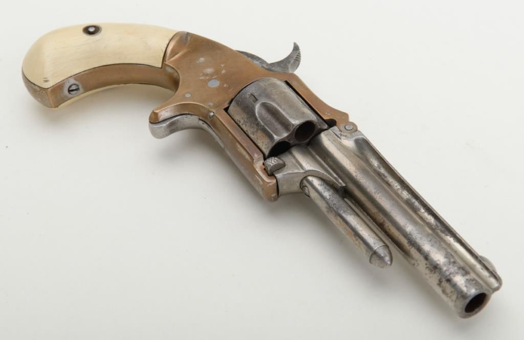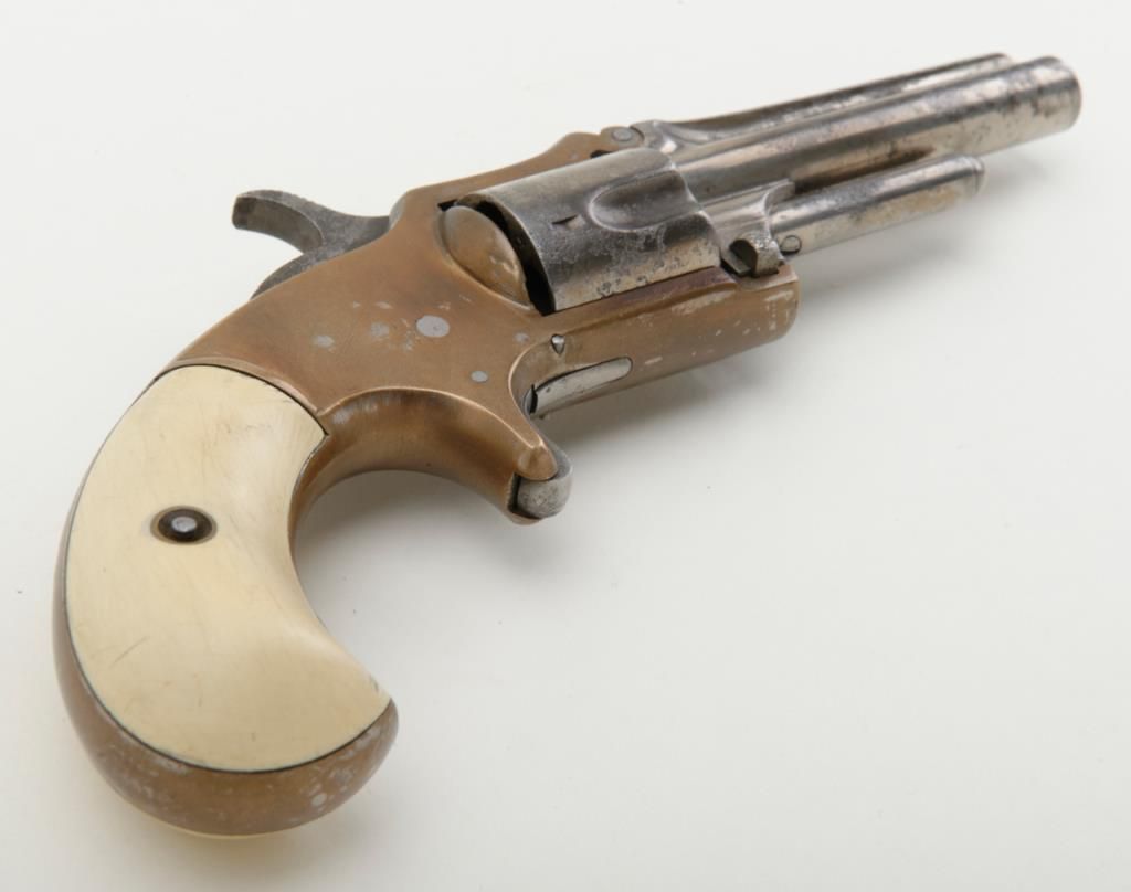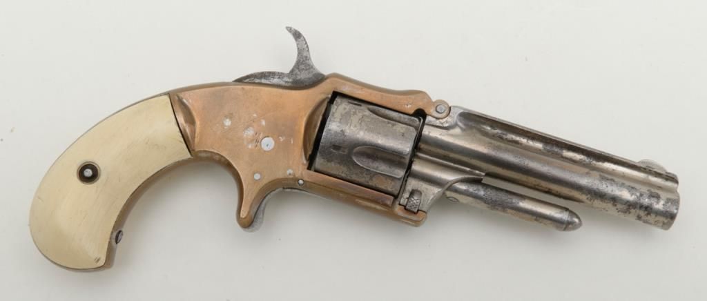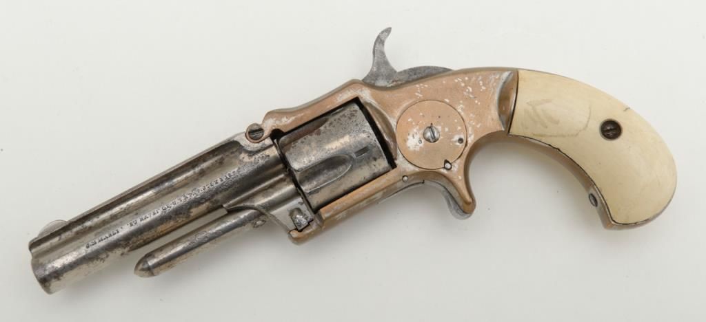 Marlin XXX Standard Model spur trigger revolver, .30 cal., 3” barrel, brass frame, nickel finish, faux ivory grips, #NVSN. This gun is in overall fair to good condition showing traces of original finish in protected areas, some scattered areas of pitting, dark bore, good action, good grips and barrel address. Est.: $150-$300.