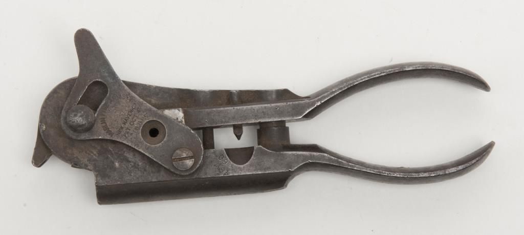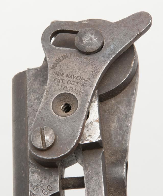 Marlin combination mold and reloading tool, last patent date 1881 marked .45-60 caliber W&K for Winchester and Kennedy rifles. The tool is in fair to good condition showing a brown patina finish and some light to moderate pitting. Markings good. Est.: $250-$500