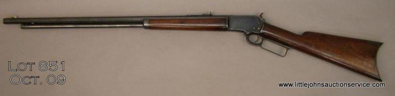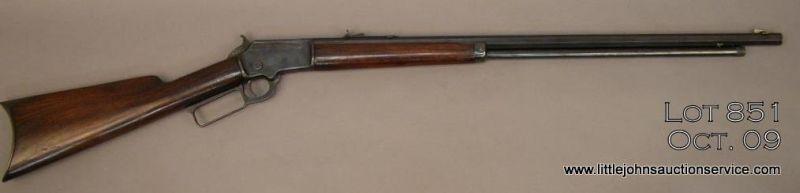 Marlin lever action rifle, “Marlin Safety” model, .30 cal., rare 26” early octagon barrel, quality old, possibly factory, re-blue, wood stocks, #71663. This gun is in overall very good condition showing the majority of its refinish, excellentbore, sharp markings, crisp action, very good wood with scattered nicks and mars from storage and a missing sliver at the front of the fore end on the right side; crescent butt plate. Est.: $500-$750.