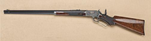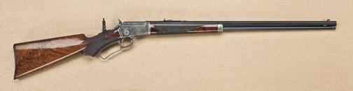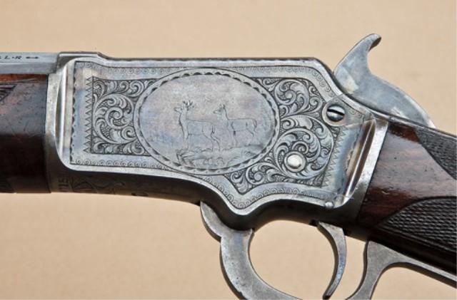 Marlin model 1892, .22 caliber lever-action rifle, factory engraved, blue and case hardened finish, fancy pattern deluxe wood stock, rubber shotgun buttplate, Lyman tang sight, serial #154715. Engraved in factory patter 5 showing two deer on left, elaborately engraved scrolls and relief, C-style checkering with pistol grip. The rifle shows 24” full octagon barrel, full magazine, and retains approx. 90-95% original blue toning slightly, 70-80% case hardening with some vivid colors and some natural toning and aging. The varnish deluxe wood stocks are very good plus to near fine with sharp checkering. A small repair on forend, some minor scratches, but at least very good plus to near fine overall. Sharp markings, crisp action, very good bore that may clean to excellent. A high grade engraved .22 Marlin. Est: $12,500 - $25,000