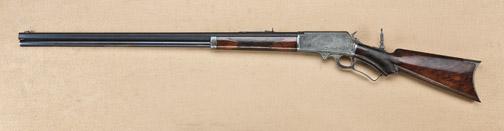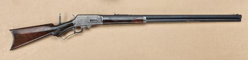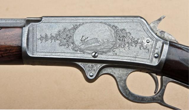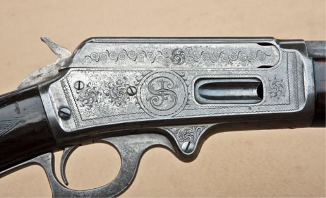 Marlin model 1893 lever action rifle, .45-90 caliber, factory engraved in grade2 pattern, 30” octagon barrel, full magazine, rifle butt, deluxe checkered wood stocks, Lyman type tang sight, blue and case hardened finish, serial #170509. The barrel and magazine tube show 50-75% original blue drifting to brown with some light erosion and pinprick pitting just starting. A few minor scratches. The barrel address and markings are sharp, the edges crisp. The frame is nicely engraved with a running stag being chased by dog in panel on left, surrounded by scroll. Right side show a vignette with intertwined initials that appear to be “JS” within a circle, surrounded by scrolls. There has been a swivel mounted in the magazine tube, and shows a bright spot with two drill holes approx. 2-1/2” at the center of the magazine in an oval shape. The frame, hammer, and lever, show traces of case hardening drifting to silvery grey with traces of faint colors in protected areas and a natural patina with some erosion and pinprick pitting. The buttstock has been broken at the wrist and repaired. The stocks have been refinished. The action is good, bore very good. An interesting large frame engraved