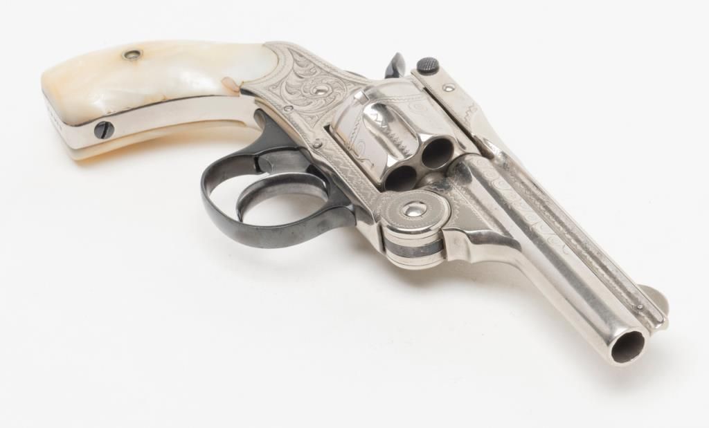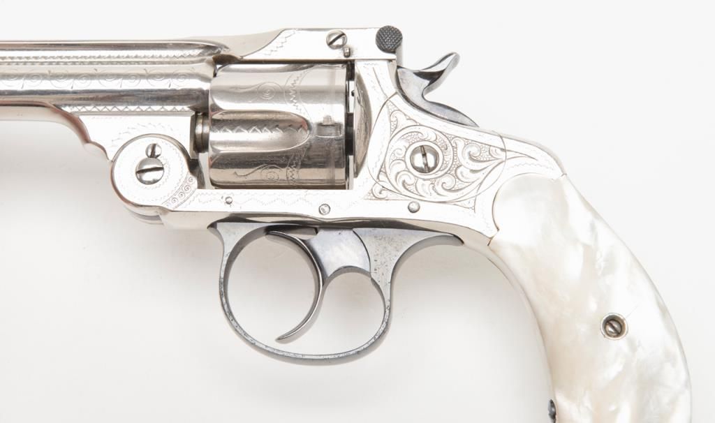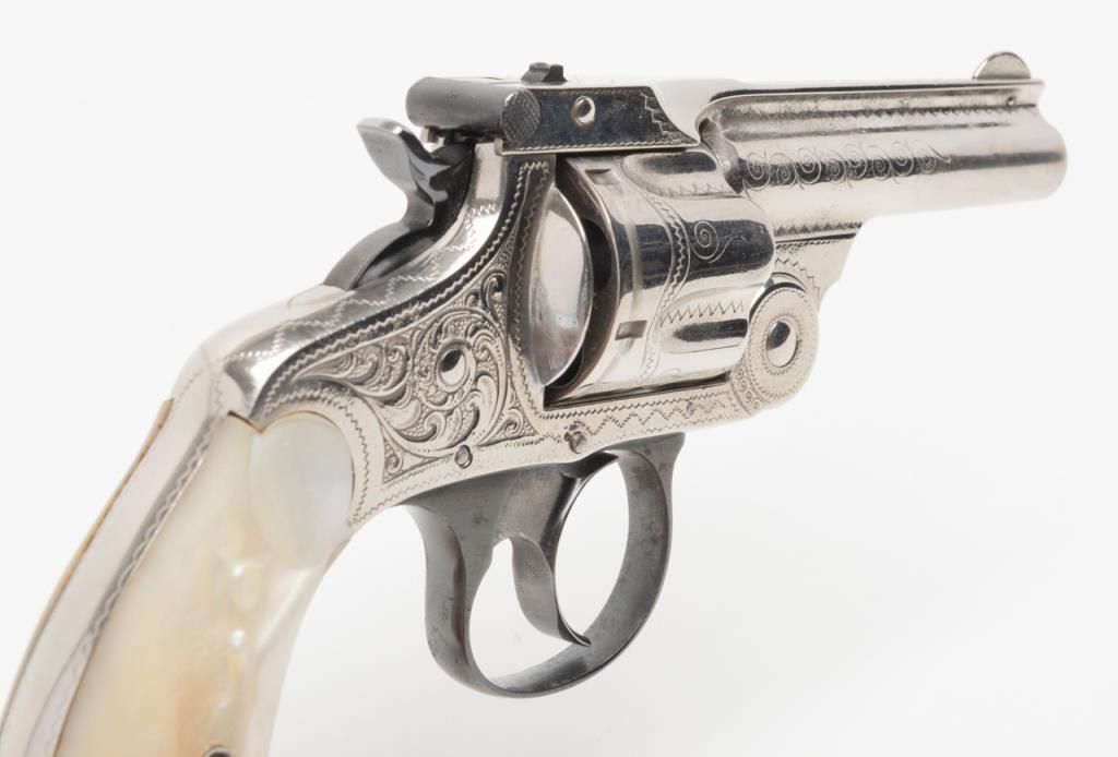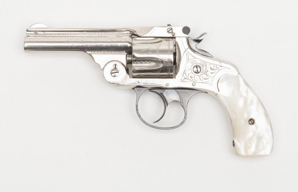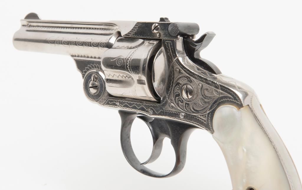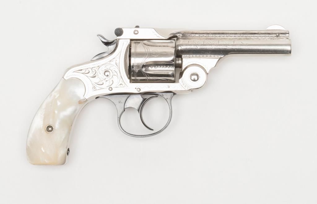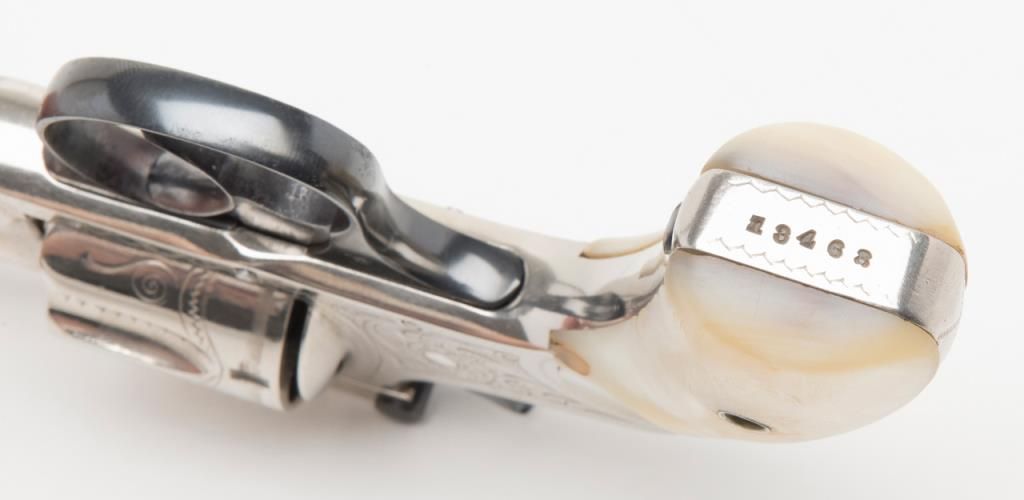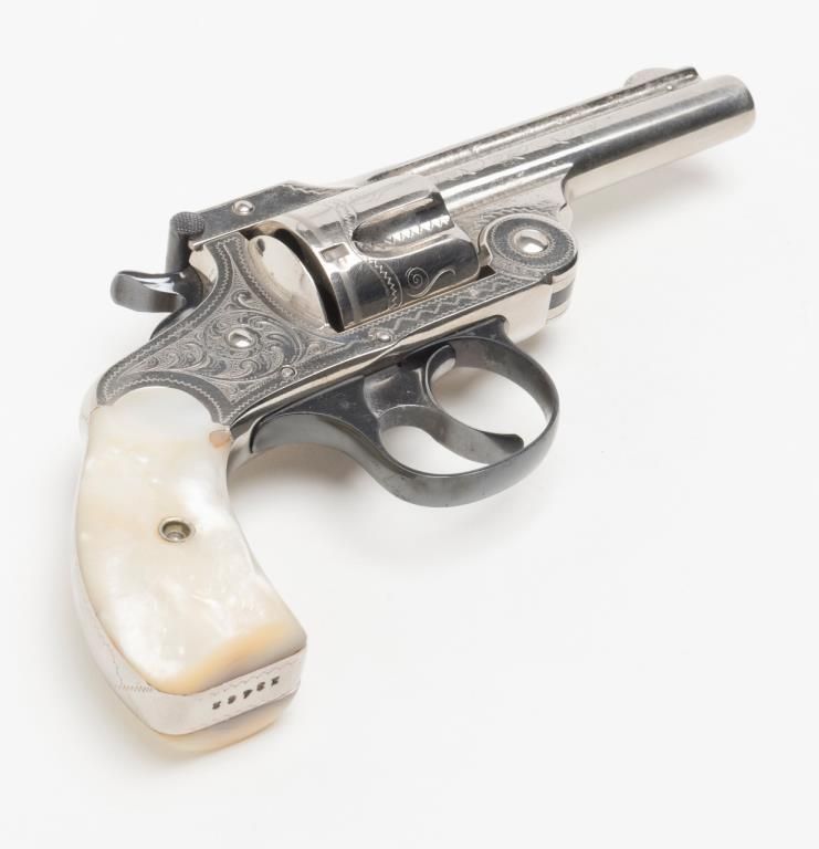 Marlin top break DA revolver, period engraved, .38 cal., 3-1/4” barrel, nickel finish, iridescent pearl grips, #13468 in overall very good condition showing a high quality older re-nickel finish of which the majority remains; very good bore, crispaction, sharp markings; beautiful thick pearl grips in overall very good to fine condition: a really nice Marlin top break that resembled the Smith & Wesson pocket top break revolver of the same period with tasteful engraving and accentedre-blued hammer, trigger and trigger guard. (Antique). Est.: $700-$1,400.