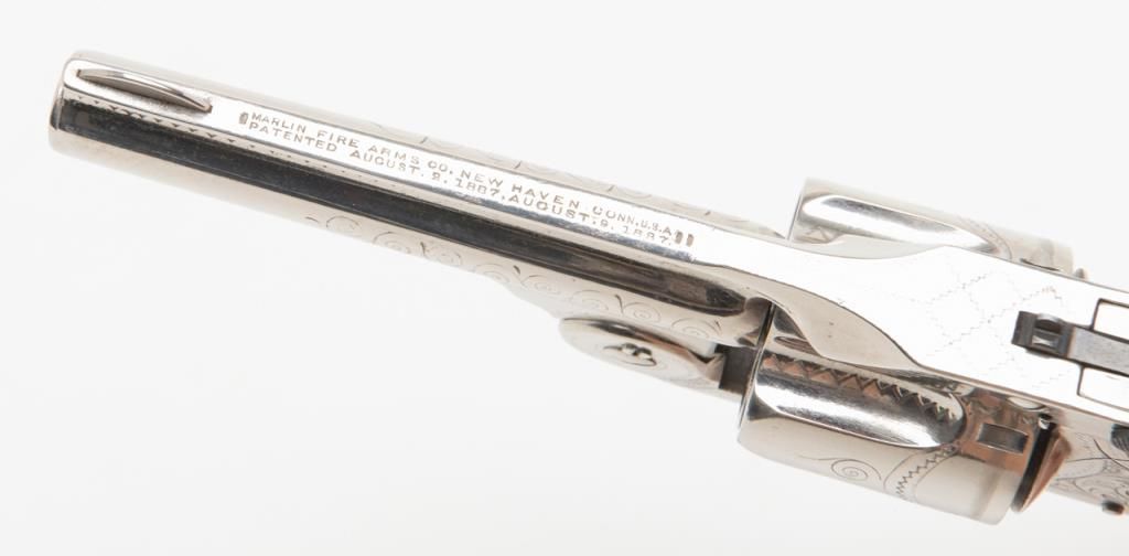 Marlin top break DA revolver, period engraved, .38 cal., 3-1/4” barrel, nickel finish, iridescent