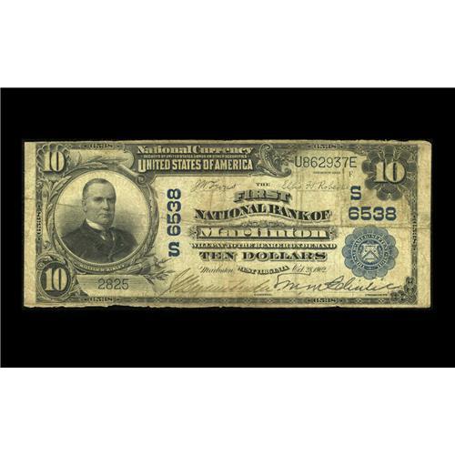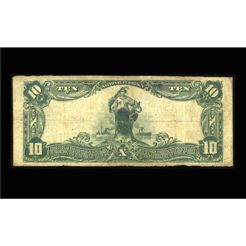 <B>Marlinton, WV</B></I> - $10 1902 Plain Back Fr. 624 <B>The First NB</B></I> Ch. # (S)6538<BR>An excessively rare large example from the only collectible bank in Pocahontas County, as Marlinton's other issuer, which emitted small notes only, is as yet unreported. The Kelly census shows just one other large note extant, and it has been four years since any note from here, large or small, has been offered to collectors at public sale. Pen signed <B>Fine+.</B></I>