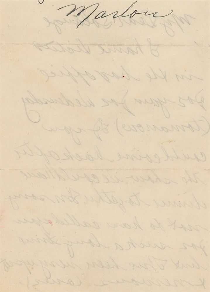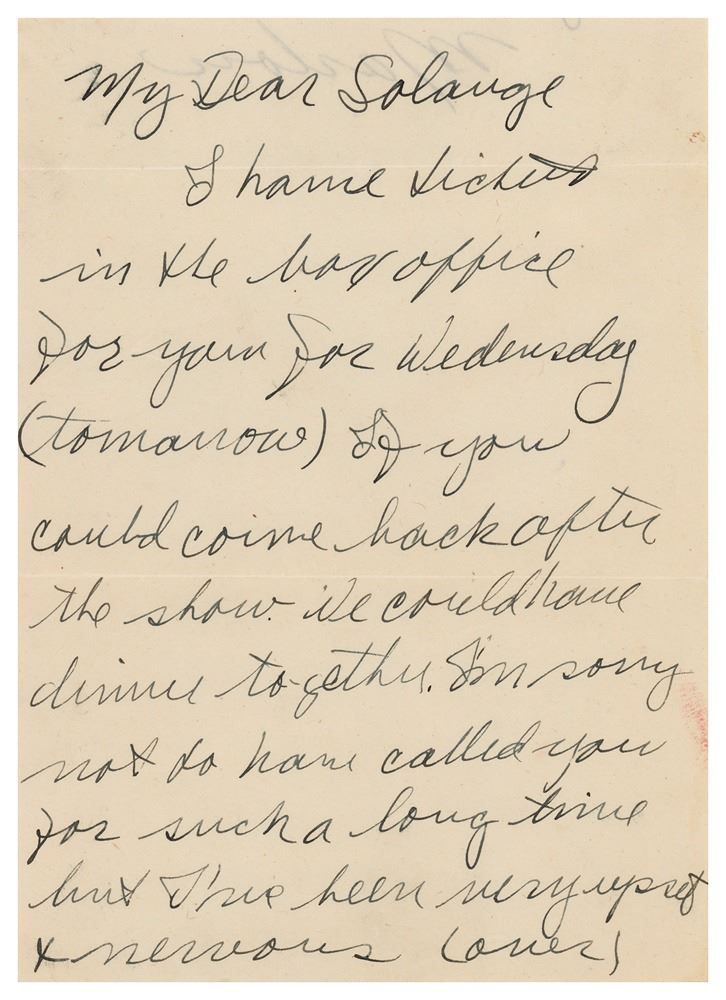 ALS signed "Marlon," one page both sides, 5.25 x 7.25, no date but circa late 1940s. Handwritten letter to French actress Solange Podell, with whom he had shared a romantic relationship. In full: "I have tickets in the box office for you for Wednesday (tomorrow) if you could come back after the show we could have dinner together. I'm sorry not to have called you for such a long time but I've been very upset and nervous." In fine condition.