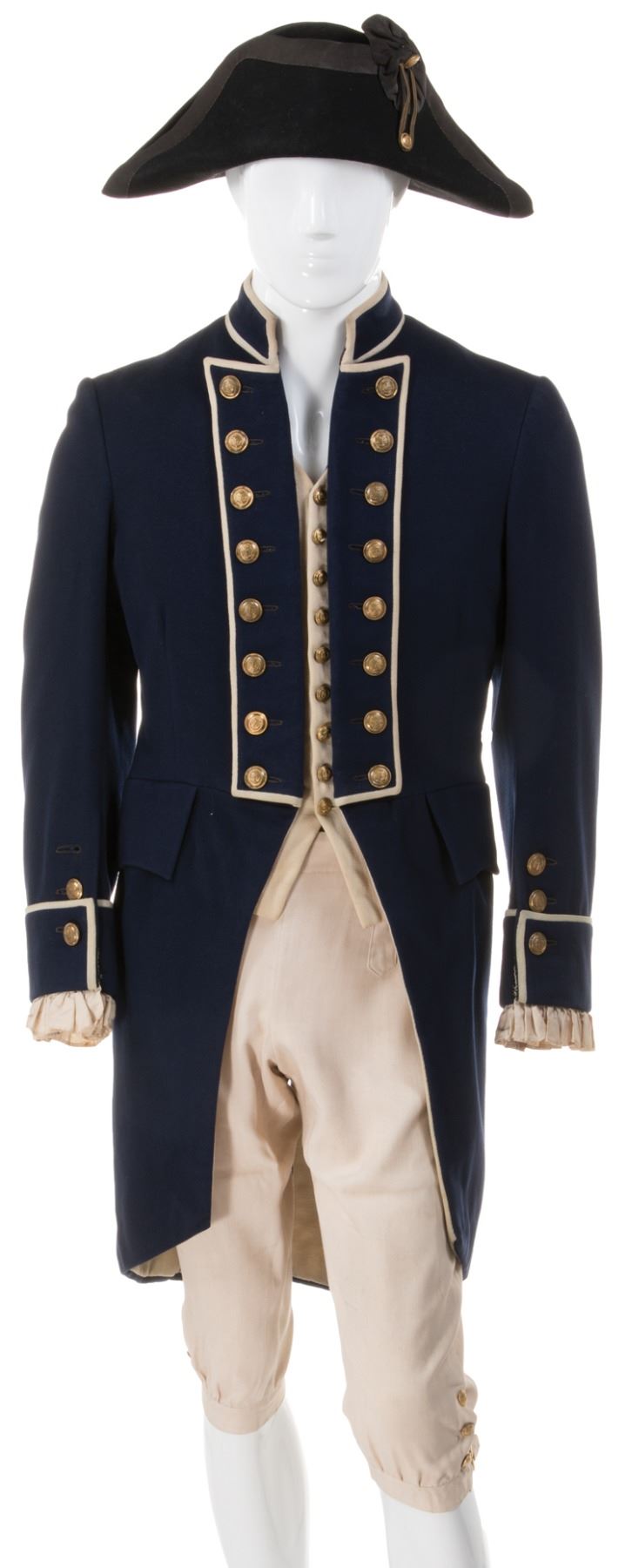 206. Marlon Brando "Fletcher Christian" Royal Navy officer uniform from Mutiny on the Bounty. (MGM, 1962) Vintage original (5) piece blue wool uniform with (1) double-breasted naval jacket trimmed at wide lapel, standing collar and cuffs with ivory wool piping, ornamented with gold metal anchor buttons, 2-faux hip flap, faux ivory wool button front closure and integral ruffled shirt cuffs, (1) matching blue wool vest with anchor button front closure, (1) ivory silk dickie with tiered collar and French lace ascot, (1) pair of creme silk knee pants with zipper and snap front closure, decorative anchor buttons at self belt and metal buckled cuffs, and (1) navy blue blocked felt Lt. hat with grosgrain ribbon embellishment, anchor button and gold bullion ornamentation. Jacket, vest and pants retain internal MGM Studio handwritten bias label, "M. Brando" and other production information. Coat highly visible throughout, dickie and pants highly visible in the opening scene boarding the ship. Exhibiting age, minor production wear, and minor staining to dickie. In vintage very good to fine condition. $8,000 - $12,000