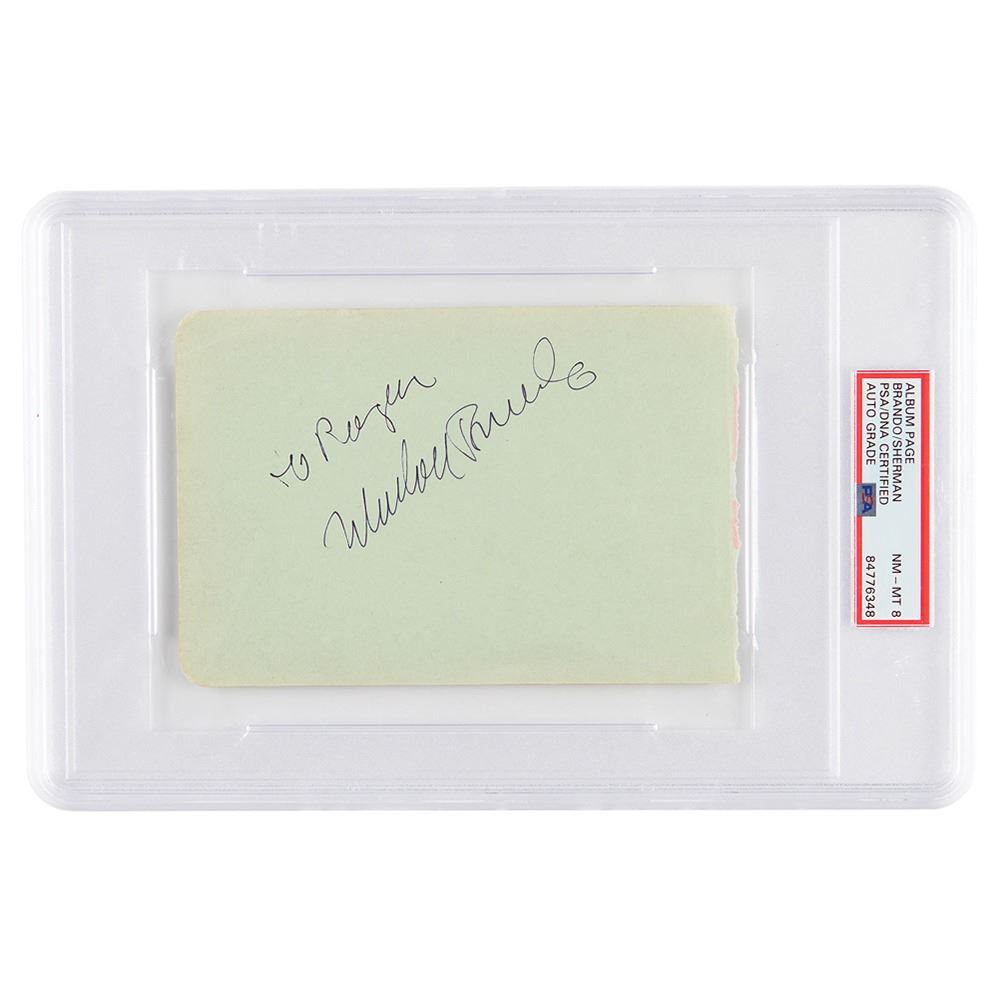 Sought-after fountain pen signature and inscription, "To Roger, Marlon Brando,& rdquo; on a green 6 x 4 album page, also signed and inscribed on the reverse by Allan Sherman. In fine condition. Encapsulated and graded by PSA/DNA as "NM-MT 8."