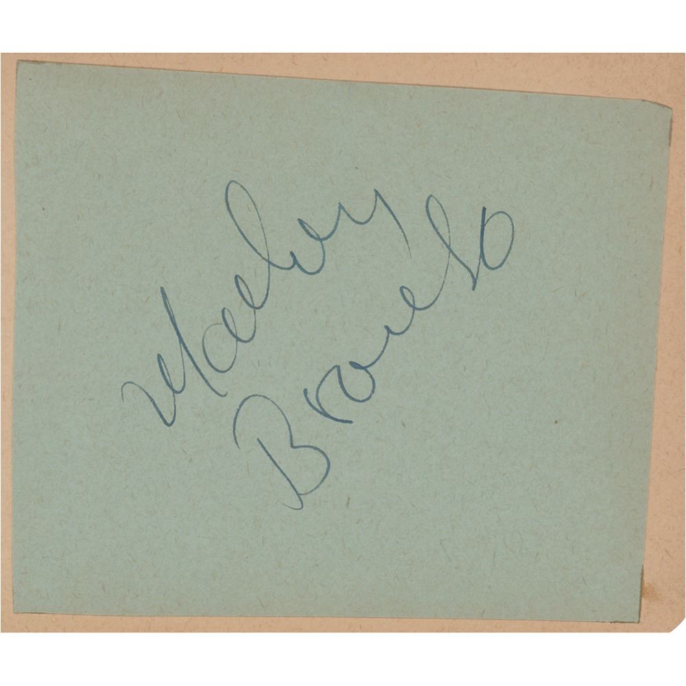 Very desirable vintage ink signature, "Marlon Brando,‰Û on a light blue 4.5 x 4 sheet affixed to a slightly larger album page. In fine condition. Accompanied by a vintage glossy 5 x 3.5 candid photo of Brando at the time of signing.