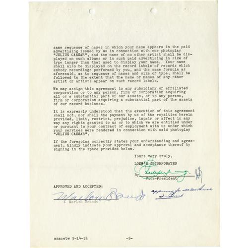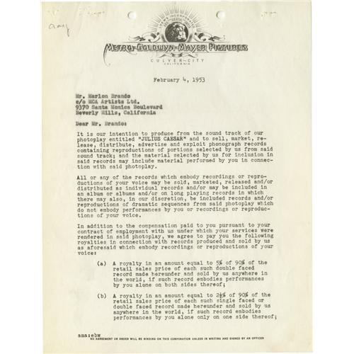 <B>Marlon Brando Signed "Julius Caesar" Contract.</B></I> A five-page royalties agreement on MGM letterhead, dated February 4, 1953, between Brando and the studio, regarding the soundtrack and selected material from <I>Julius Caesar.</B></I> Brando's casting as Mark Antony had raised eyebrows, but he'd delivered a spellbinding performance that proved his versatility and true dramatic power, even in the classics. Boldly signed on the last page by Brando in blue ink, and in Very Fine to Excellent condition with the usual staple and punch holes. <I>Accompanied by LOA from PSA/DNA.</B></I><BR><BR><b>Shipping:</b> Small Flat (<a target="_blank" href="http://www.heritageauctions.com/common/shipping.php">view shipping information</a>)