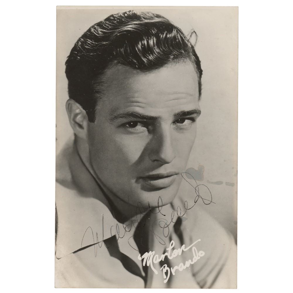 Vintage glossy 3.5 x 5.5 postcard photo of Marlon Brando in his prime, signed in black ink. Lower portion bears a white facsimile signature. In very good to fine condition, with light surface scuffing, and a stain to the right of Brando's mouth.