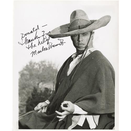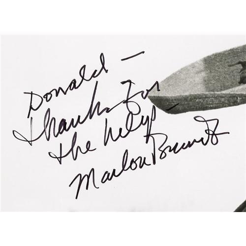 <B>Marlon Brando Signed "The Appaloosa" Photo.</B></I> A b&w 8" x 10" glossy of Brando from the 1966 Western, inscribed "Donald - Thanks for the help" and signed by Brando in black ink. Made during Brando's so-called "lost decade," the movie featured him opposite John Saxon as a man seeking to reclaim a stolen horse. Brando's signature is a tough find, as he rarely signed autographs, especially later in life. In fact, his autograph is so valued by collectors that many of the personal checks he wrote were never cashed because his signature was usually worth more than the amount on the check. This particular sample -- and the photo itself -- is in Excellent condition. <I>From the collection of Marlon Brando.</B></I> <I>Accompanied by LOA from PSA/DNA.</B></I>