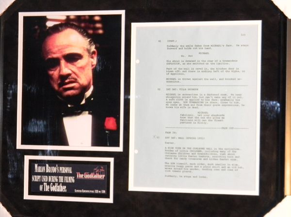 Limited edition framed display featuring an original script page from "The Godfather" personally owned and used by star Marlon Brando. This item comes with a certificate of authenticity guaranteed for the life of the piece.