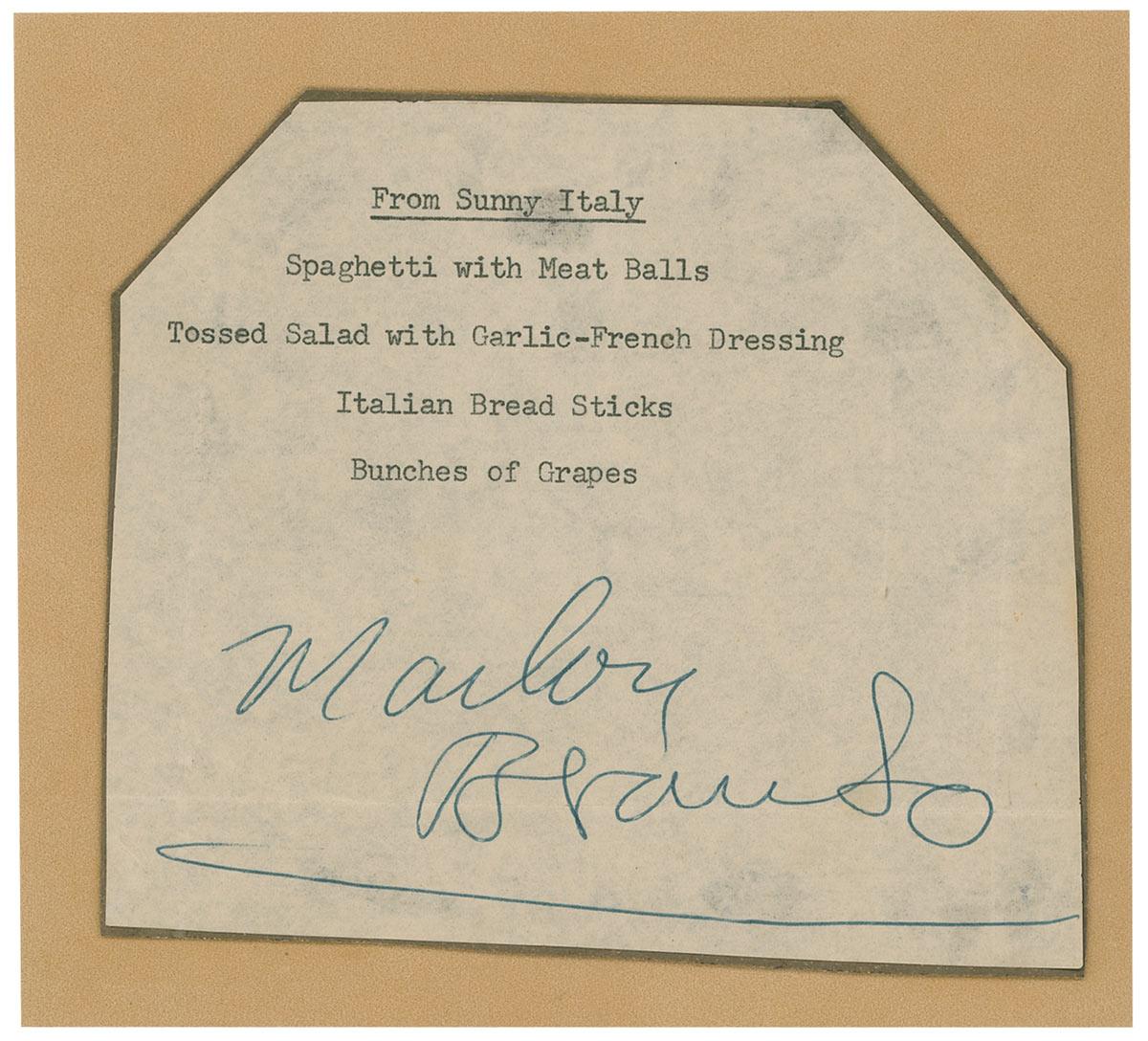 Unique ‘dinner suggestion’ typed on an approximately 5 x 4.25 trimmed page signed at the bottom in ballpoint “Marlon Brando.” In full: “From Sunny Italy, Spaghetti with Meat Balls, Tossed Salad with Garlic-French Dressing, Italian Bread Sticks, Bunches of Grapes.” The sheet is affixed to a same-sized piece of paper which in turn is affixed to a 5.5 x 5.25 piece of mat. In fine condition, with horizontal fold crossing his last name, wrinkling, show-through from the paper backing, and irregularly trimmed edges and diagonally cut top corners. Presumably, this was a response for a celebrity menu item for an edition of the Betty Crocker Picture Cook Book. A one-of-a-kind menu item!