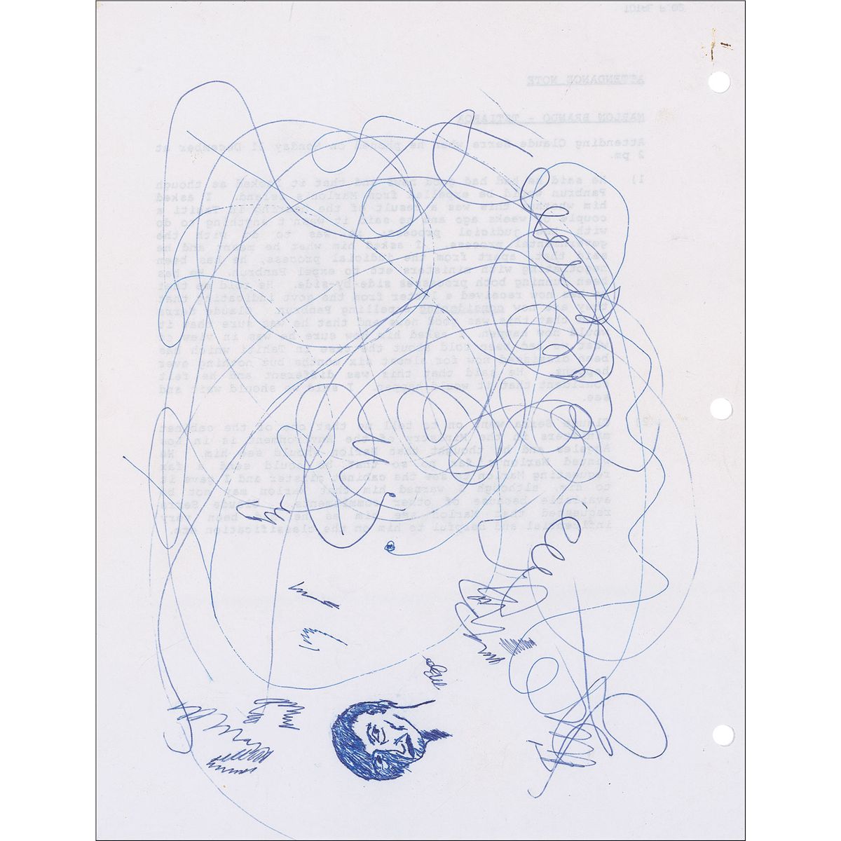 Original ballpoint sketch of a man looking over his shoulder, plus several squiggles and scribbles, on a white 11 x 8.5 sheet, signed “MB.” In very good to fine condition, with wrinkling, small rust mark, scattered creases, edge punch holes, and show-through from two printed paragraphs related to events on Brando’s island home of Tetiaroa on the reverse. Accompanied by a full letter of authenticity from PSA/DNA. A unique work, to say the least!