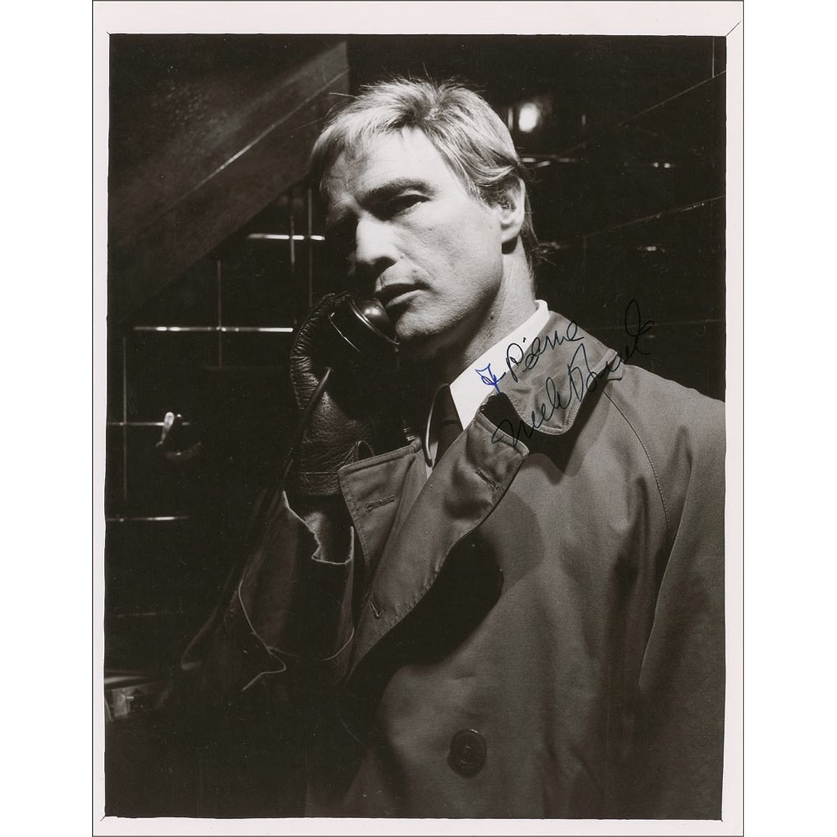Vintage glossy 8 x 10 photo of Brando from The Night of the Following Day , signed and inscribed in fountain pen “To Pierre, Marlon Brando.” In very good to fine condition, with light contrast to signature, diagonal crease to lower right corner, mild rippling along left edge, and scattered light surface marks and rubbing.
