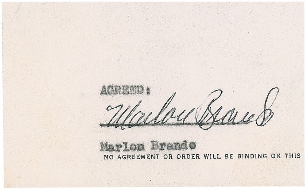 Pristine ink signature, “Marlon Brando,” on an off-white 4 x 2.5 slip, clipped from the closing of a contract. In very fine condition.
