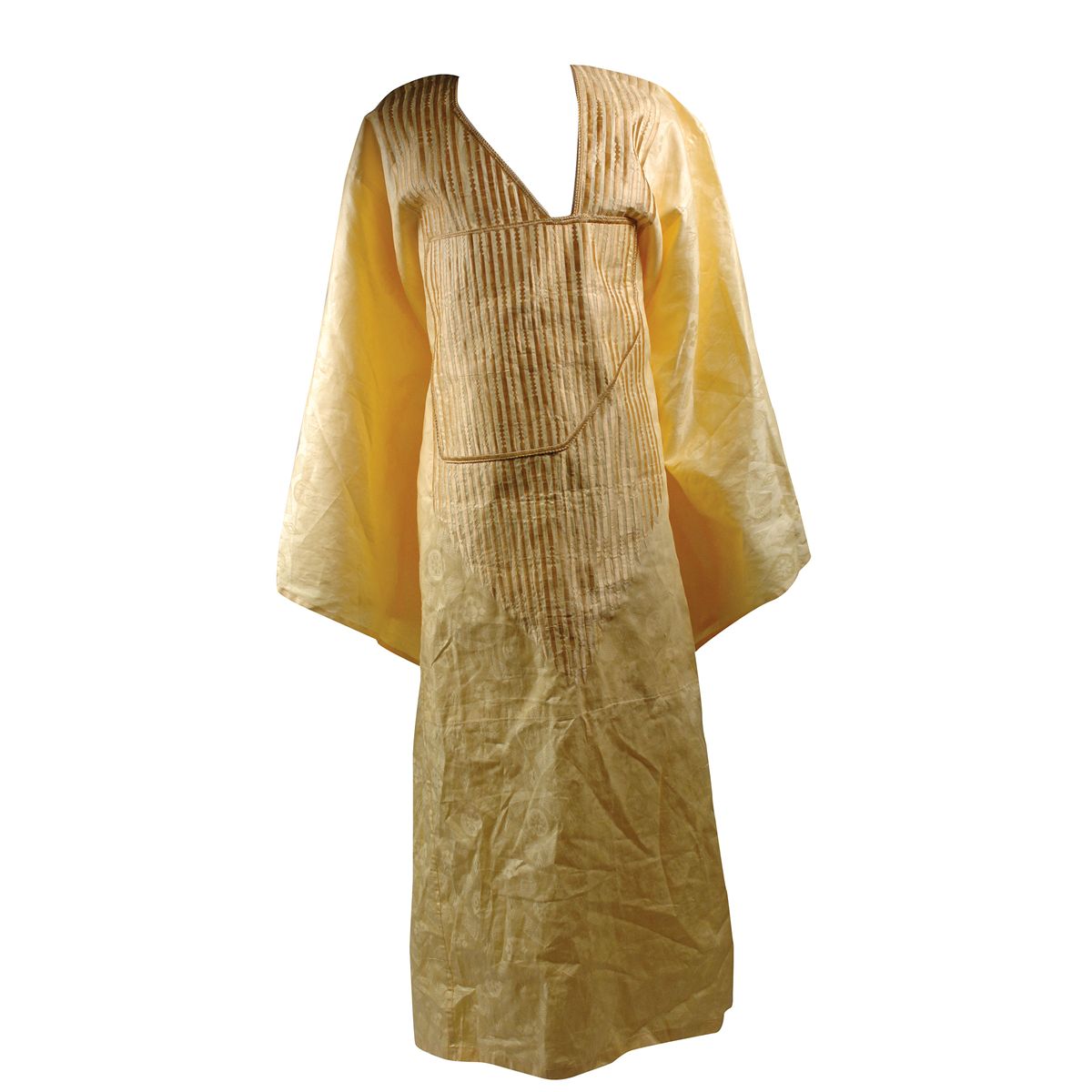 Brando’s personally-owned and-worn kaftan from the 1996 film The Island of Dr. Moreau, bearing a Mawuli Clothing tag sewn inside. Garment is of a very large size and consists of an elaborately patterned yellow cloth with golden trim around the neck and chest areas. In fine condition. Consignor notes that Brando used to wear this around the house. Provenance: Marlon Brando’s business manager and lifelong companion JoAn Corrales. Accompanied by a letter of provenance from Corrales.