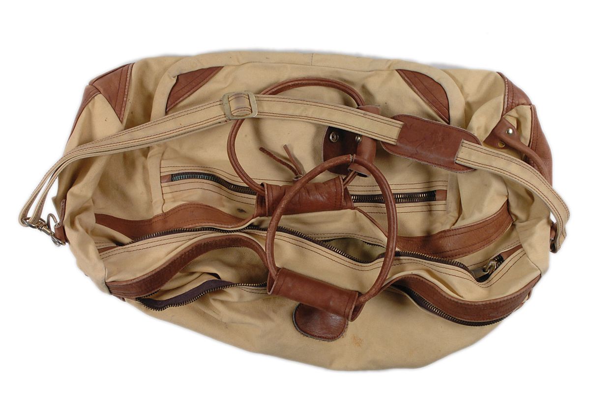 Brando’s personal overnight bag constructed of beige canvas cloth and brown leather, approximately 21? in length. In very good condition, with scattered soiling and wear from use. Provenance: Marlon Brando’s business manager and lifelong companion JoAn Corrales. Accompanied by a letter of provenance from Corrales.