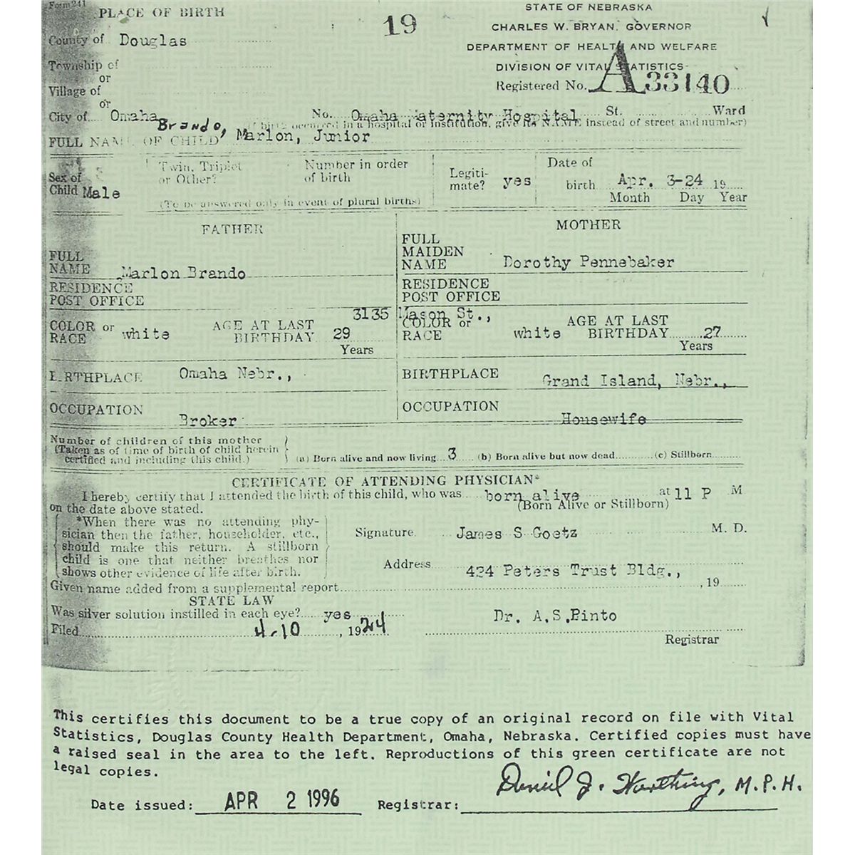 Official re-issued copy of Brando’s birth certificate, one page, 6.75 x 7.5, issued on April 2, 1996, and blindstamped to the lower left with a seal that reads, “Douglas County Health Department Vital Statistics.” The certificate details all relevant information regarding his birth, indicating that he was born at 11 PM on “Apr. 3-24,” to “Marlon Brando” and “Dorothy Pennebaker.” Text at the bottom reads, in part: “This certifies this document to be a true copy of an original record on file with Vital Statistics, Douglas County Health Department, Omaha, Nebraska. Certified copies must have a raised seal in the area to the left.” In fine condition, with staple holes to the upper left corner. Accompanied by its original Douglas County Health Department envelope. Provenance: Marlon Brando’s business manager and lifelong companion JoAn Corrales. Accompanied by a letter of provenance from Corrales.