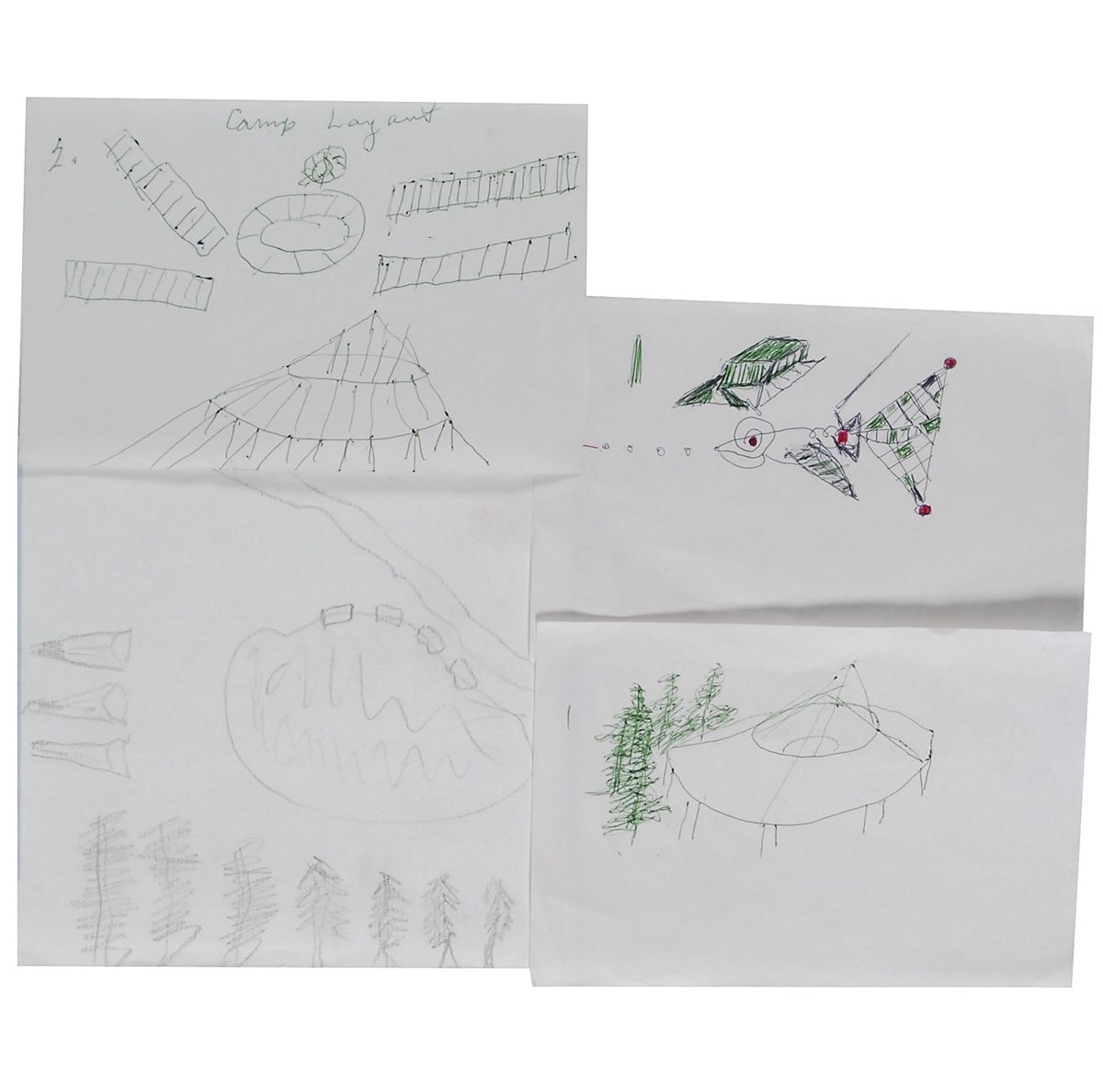 Four original unsigned sketches by Brando, depicting various aspects of his ‘retreat.’ Three are in green, red, and black ink on individual off-white 6 x 4 sheets, and show an overall layout of the camp, a treehouse-type structure, and another more abstract diagram. The fourth is a pencil sketch on an off-white 6 x 5.5 sheet, showing an aerial view of a lake surrounded by trees and teepees. Also includes the remaining unused portion of his 6 x 5.5 sketchpad. In overall fine condition. Provenance: Marlon Brando’s business manager and lifelong companion JoAn Corrales. Accompanied by a letter of provenance from Corrales.