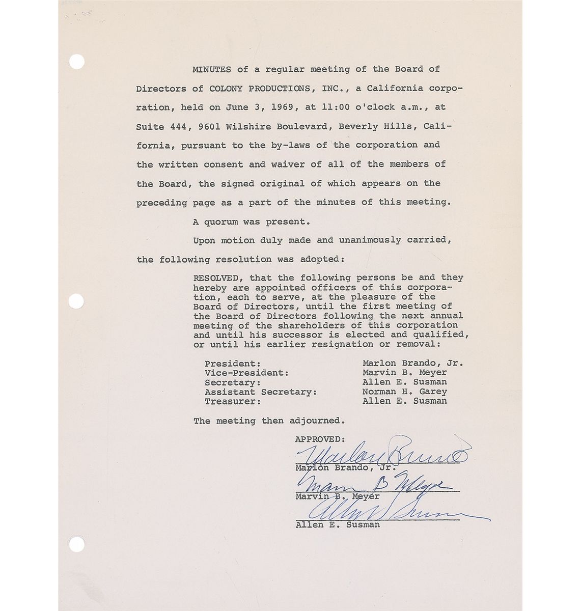 DS, one page, 8.5 x 11, June 3, 1969. Minutes of a meeting of Colony Productions, Inc., which adopted a resolution appointing officers of the corporation, with Brando having been appointed president of the company until the next year’s annual meeting. Signed at the conclusion by Brando, and also signed by Marvin B. Meyer and Allen E. Susman. In fine condition, with punch and staple holes to left side.