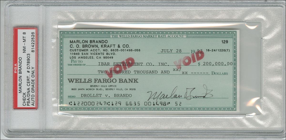 Personal check, 6 x 2.75, filled out in type and signed by Brando, payable to Ibar Settlement Co. Inc. for $200,000, July 28, 1993, with “Drollet v. Brando” typed into the memo line. Encapsulated in a plastic PSA authentication holder, with an autograph grade on NM-MT 8. In fine condition, with two red “Void “ stamps across front of check, neither affecting the clean signature. The Drollet and Brando families had been linked in tragedy for several years by the time this check was written. Marlon Brando's daughter, Cheyenne, and her half-brother, Christian Brando, were implicated and convicted in the 1990 shooting of Dag Drollet at Brando’s California estate. The death of Drollet, the father of Cheyenne's child, led to charges, countercharges, and lasting enmity between the Drollet and Brando families. This check recalls the highly publicized voluntary manslaughter conviction and subsequent five-year jail sentence for Marlon's son.