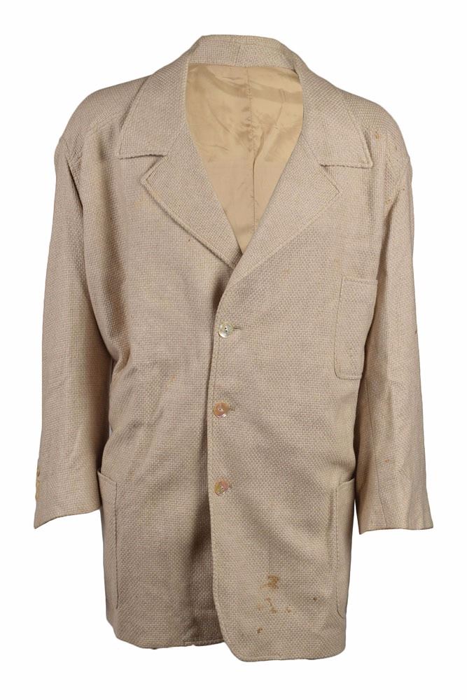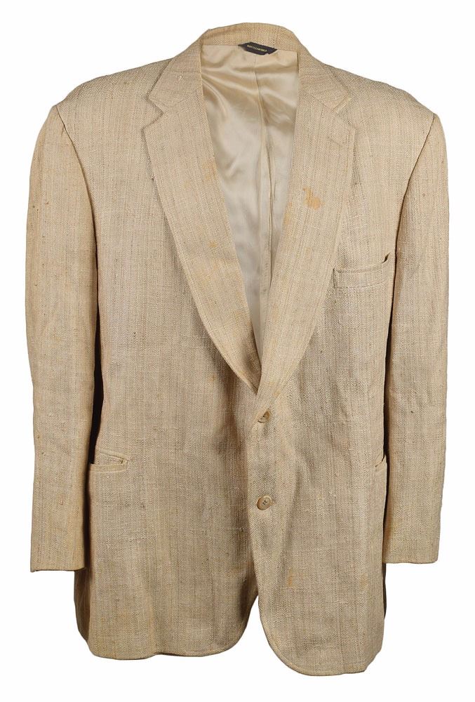 Two of Marlon Brando's personally-owned woven suit jackets: a cream-colored jacket by Vincent Pastena featuring three mother-of-pearl buttons on the front; and a taupe jacket by Rochester Special Man featuring two beige buttons on the front, marked inside as size "52." In overall very good to fine condition, with scattered staining and expected signs of wear. Provenance: From the Archives of Miko Brando, Julien's, June 2015.