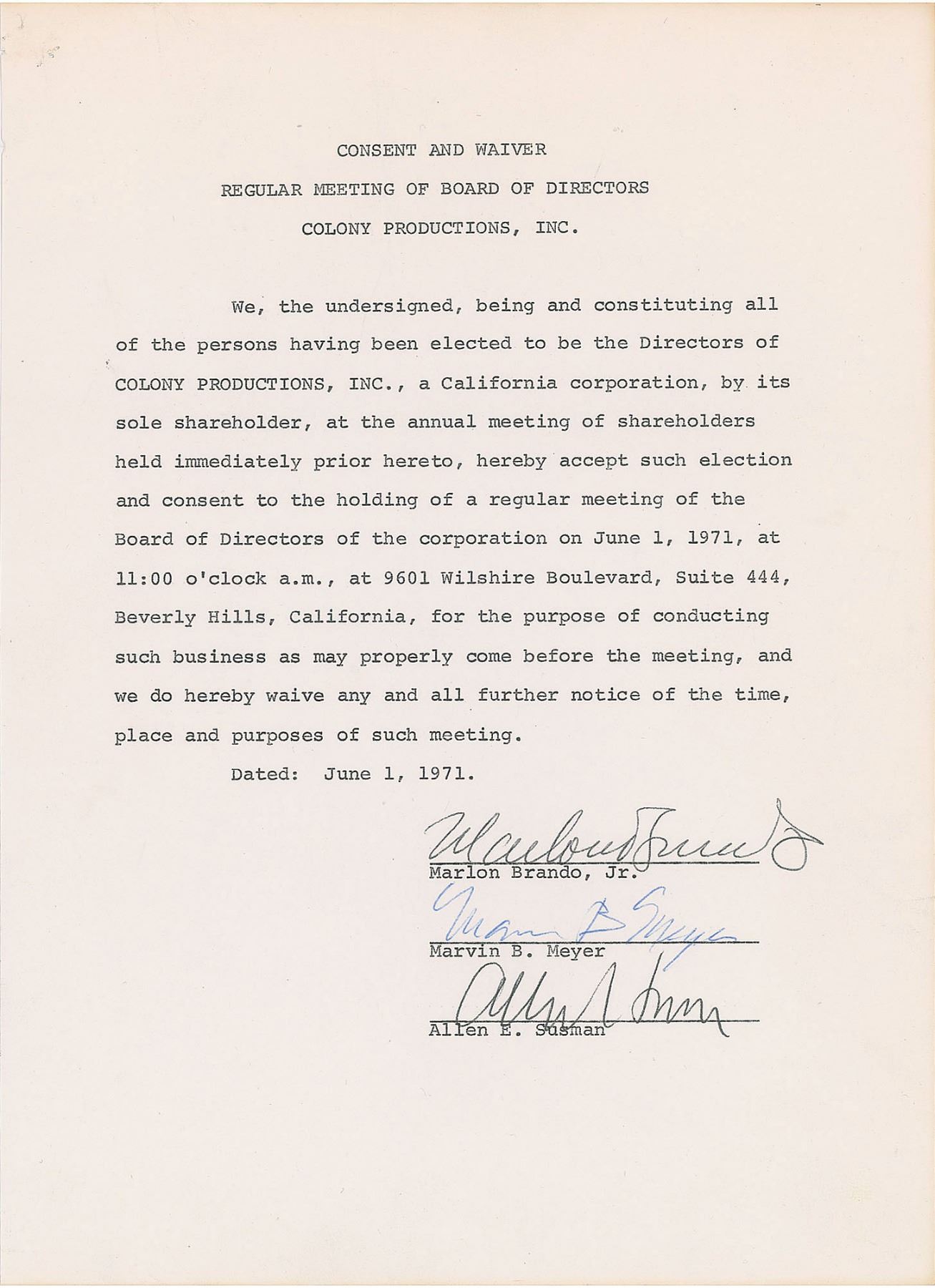 DS, signed “Marlon Brando, Jr.,” one page, 8 x 11, June 1, 1971. Consent form from the directors of Colony Productions agreeing to the holding of a regular meeting of the Board of Directors. Signed at the conclusion in black ballpoint by Brando, and countersigned by Marvin B. Meyer and Allen E. Susman. In fine condition, with some light vertical creasing.