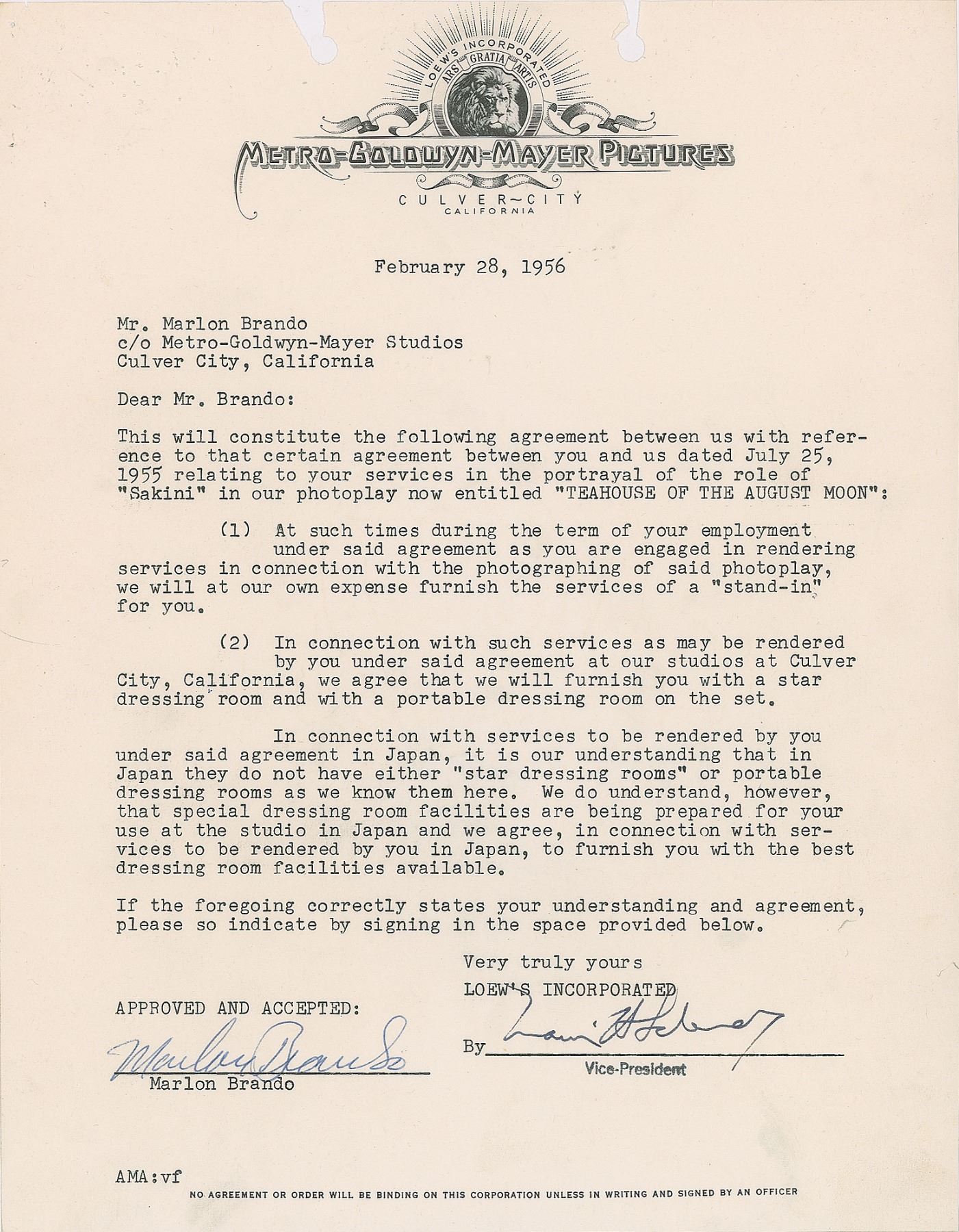 DS, one page, 8.5 x 11, February 28, 1956. MGM document pertaining to Brando's agreement for "the portrayal of the role of 'Sakini' in our photoplay now entitled 'Teahouse of the August Moon.'" The agreement notes that MGM will furnish a 'stand-in' during filming and provide Brando with private dressing rooms while filming in Hollywood. It continues: "In connection with services to be rendered by you under said agreement in Japan, it is our understanding that in Japan they do not have either 'star dressing rooms' or portable dressing rooms as we know them here. We do understand, however, that special dressing room facilities are being prepared for your use at the studio in Japan and we agree, in connection with services to be rendered in Japan, to furnish you with the best dressing room facilities available." Signed at the conclusion in blue ballpoint by Brando and countersigned by a studio vice president. In fine condition, with staple holes and file holes to the top. A comedy satirizing the US occupation of Japan in the aftermath of World War II, The Teahouse of the August Moon—portions of which were shot on-site in Japan—became MGM's biggest box office success of 1956.