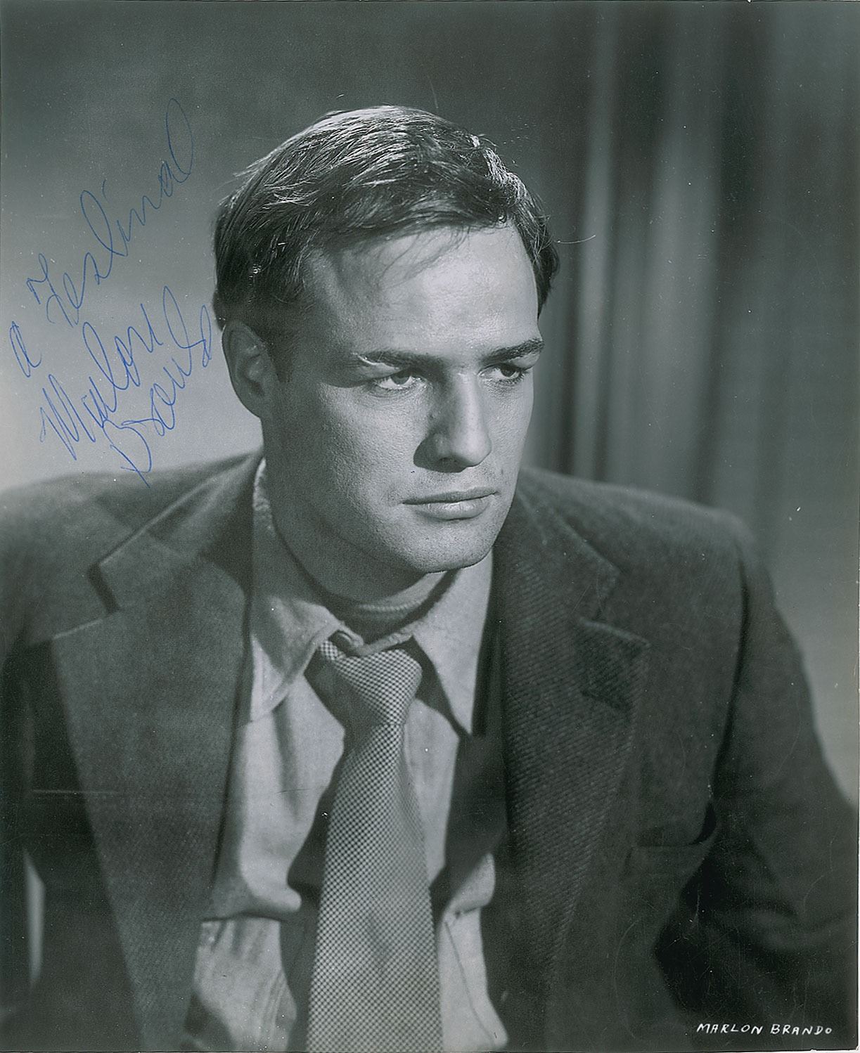 Outstanding vintage glossy 7.5 x 9 photo of Brando in his memorable role as dockworker Terry Malloy, testifying in the courtroom scene from Elia Kazan's 1954 classic On the Waterfront, signed and inscribed in blue ballpoint, "A Festival, Marlon Brando.” Reverse bears a Fanegar credit stamp. In very good to fine condition, with trimmed edges, scattered light creasing, and surface impressions from a notation on the back. On the Waterfront won an impressive eight Oscars at the 1955 Academy Awards, and Brando took home the prize for Best Actor in a Leading Role. A superlative signed portrait from an iconic crime drama.