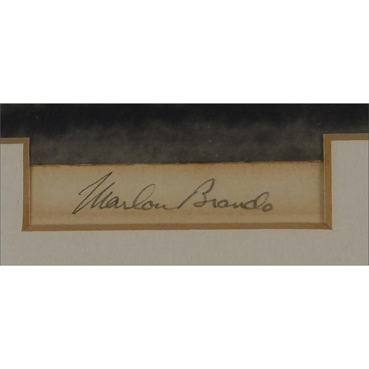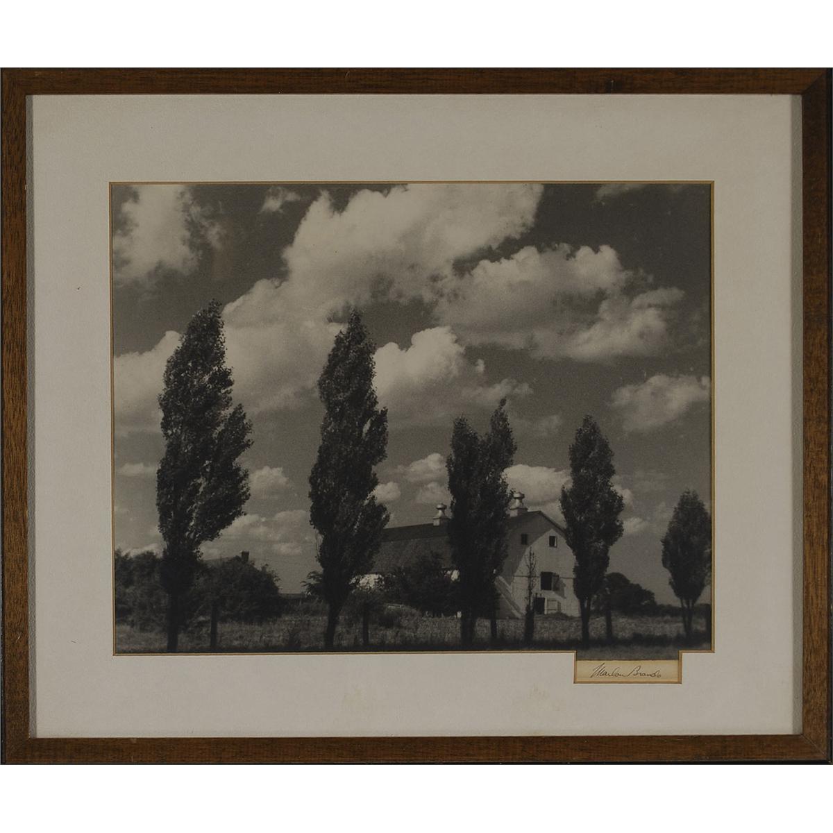 Matte-finish 12.75 x 10.25 photo of a farm house taken by Brando, signed in pencil on the tan mat, then again creatively matted to to display the signature and framed to an overall size of 18 x 15.25. In fine condition with mild toning to the signature area. According to the consignor, the photo is displayed in its original frame and originated from a 2005 auction of Brando’s personal property at Christie’s.