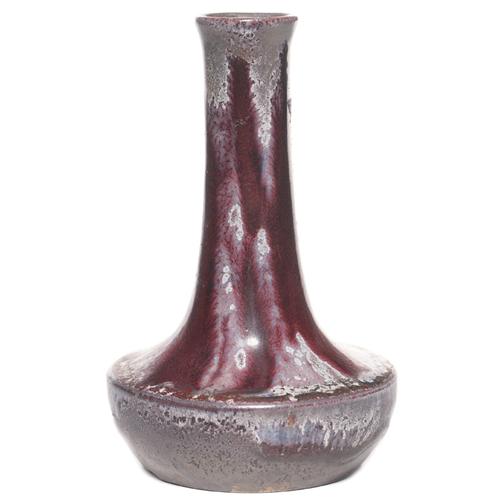 Marlotte vase, small form with flared bottom covered in a red, gray and purple matt, marked,6in.h, factory base chips and factory flaw at rim;with a European Art Pottery vase,(not shown), unusual form with raised leaf designs under a blue and green drip,