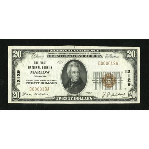 <B>Marlow, OK</B></I> - $20 1929 Ty. 1 <B>The First NB</B></I> Ch. # 12129<BR> Broad margins, deep embossing, and most pleasing paper quality is noted on this Serial Number 19 issue. A lone corner bend and a touch of handling accounts for the grade as this piece likely never entered the Oklahoma channels of commerce. <B>Choice About Uncirculated.</B></I><BR><I>From The Rolling Plains Collection</B></I><BR><BR><b>Shipping:</b> Coins & Currency (<a target="_blank" href="http://www.heritageauctions.com/common/shipping.php">view shipping information</a>)