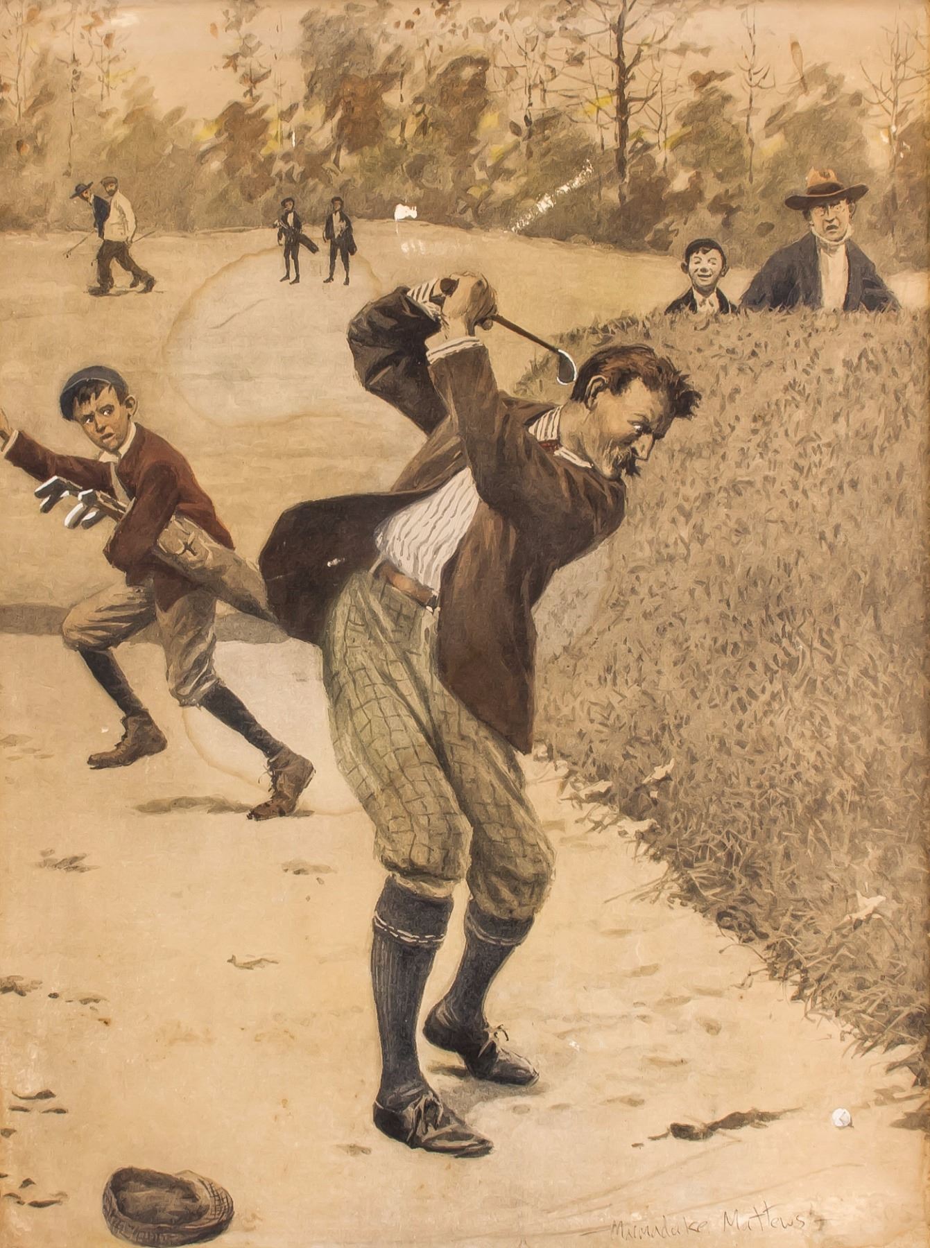 Illustration of an angry golf player hitting out of the hazard; print on paper; framed; signed and attr. Marmaduke Matthews on lower right corner; 19.5 inches x 14.5 inches