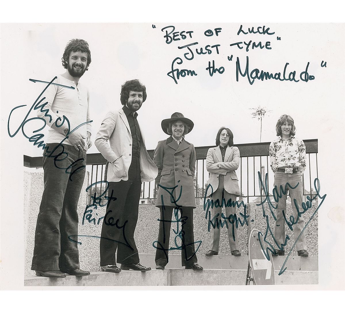 Glossy 10.25 x 8 publicity photo of Marmalade, signed by Junior Campbell, Pat Fairley, Dean Ford, Graham Knight, and Alan Whitehead, and inscribed in black felt tip, “‘Best of Luck Just Tyme’ from the ‘Marmalade.’” Heavy creasing, a spot of soiling in the right border, and some show-through and wrinkling from adhesive and mounting remnants on reverse, otherwise very good condition.