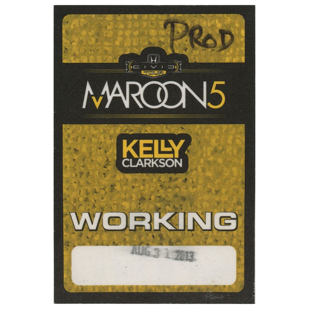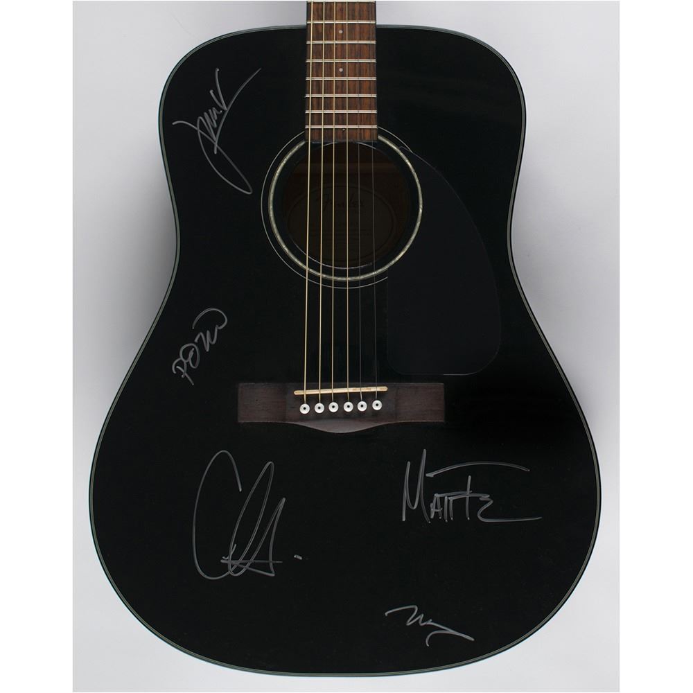 Black-bodied Fender acoustic guitar signed on the body in silver ink by Adam Levine, James Valentine, Mickey Madden, Matt Flynn, and PJ Morton. In fine condition. Accompanied by a Fender hardshell carrying case, and an unused 'working' backstage pass for a Maroon 5 concert at the Comcast Theatre in Hartford, Connecticut, on August 31, 2013, the date these autographs were obtained.